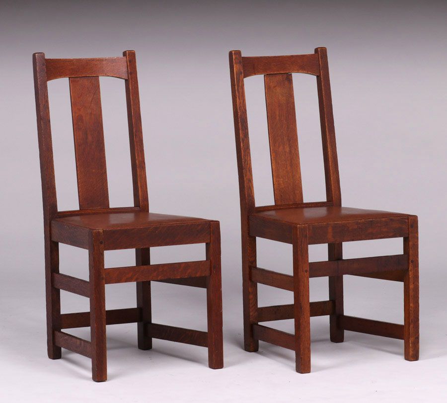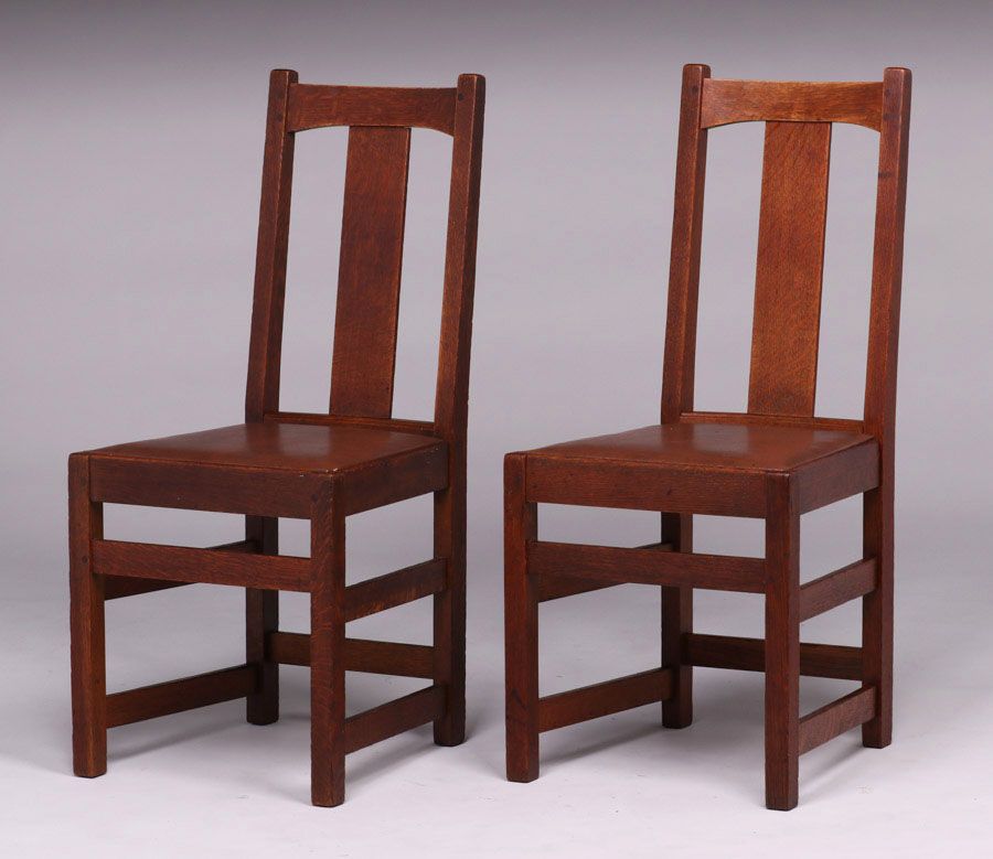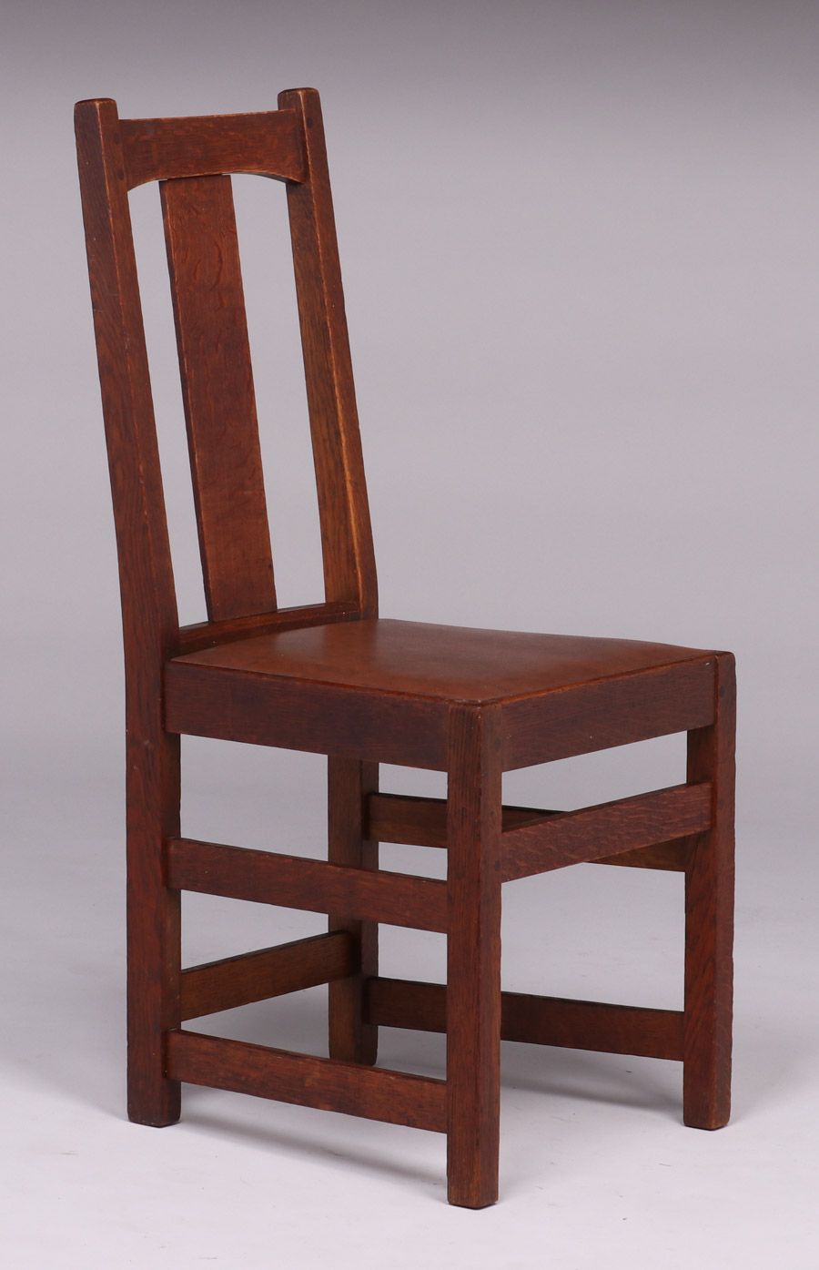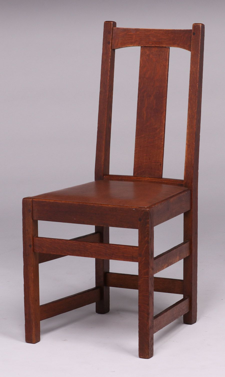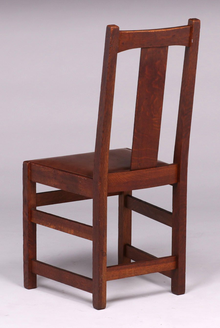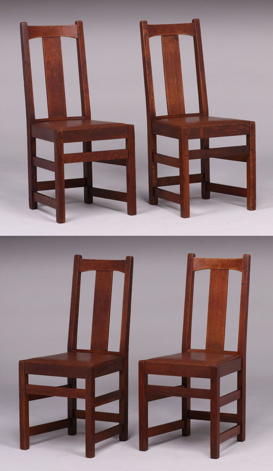 Limbert Set of 4 Chairs c1910. Signed with branded mark. Excellent original finish and original leather. Very sturdy. 36"h x 16.5"w x 16"d SOLD