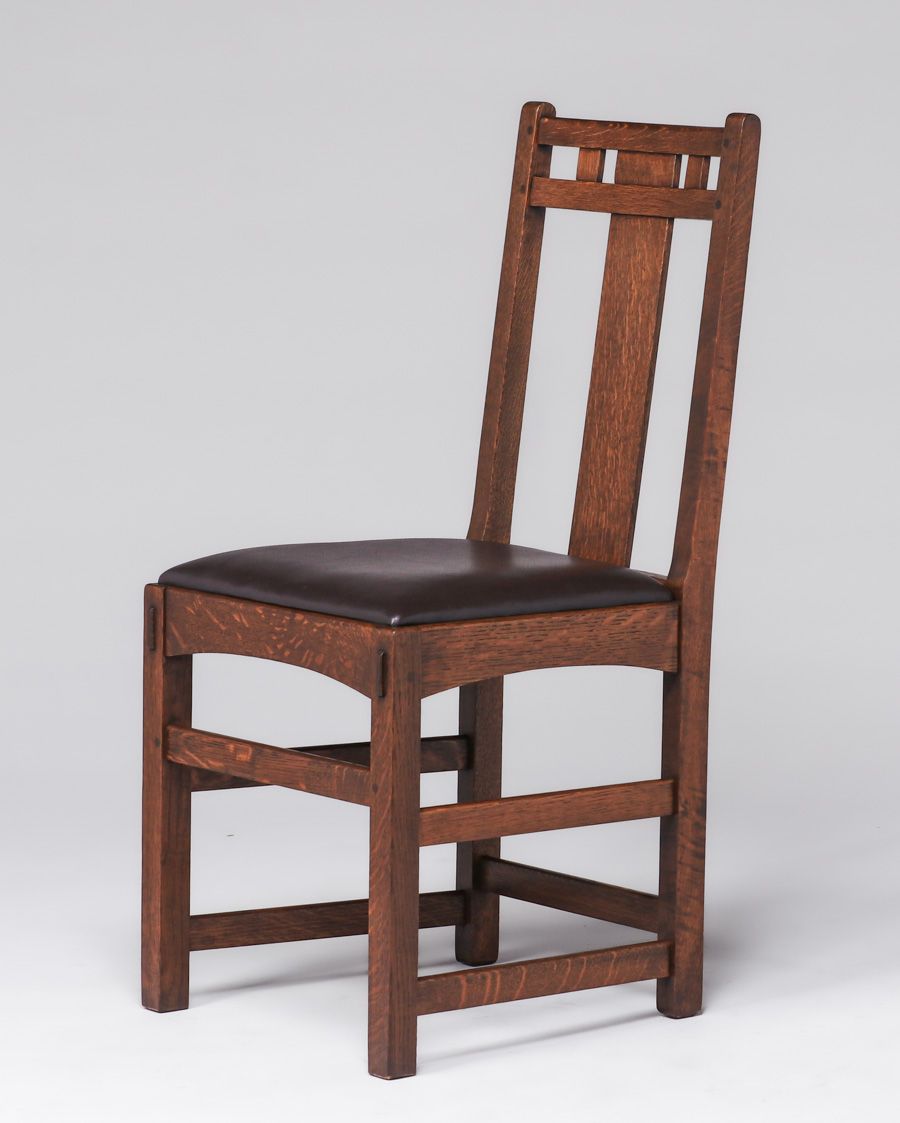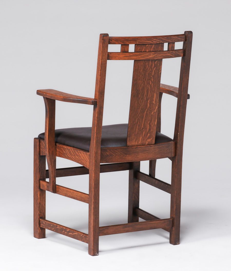 Limbert Set of 6 Dining Chairs c1910. Signed with branded mark. Very nicely refinished. Rock solid sturdy. Armchair 37"h x 24.5"w x 20"d. Side chairs 37"h x 17"d x 18"w SOLD