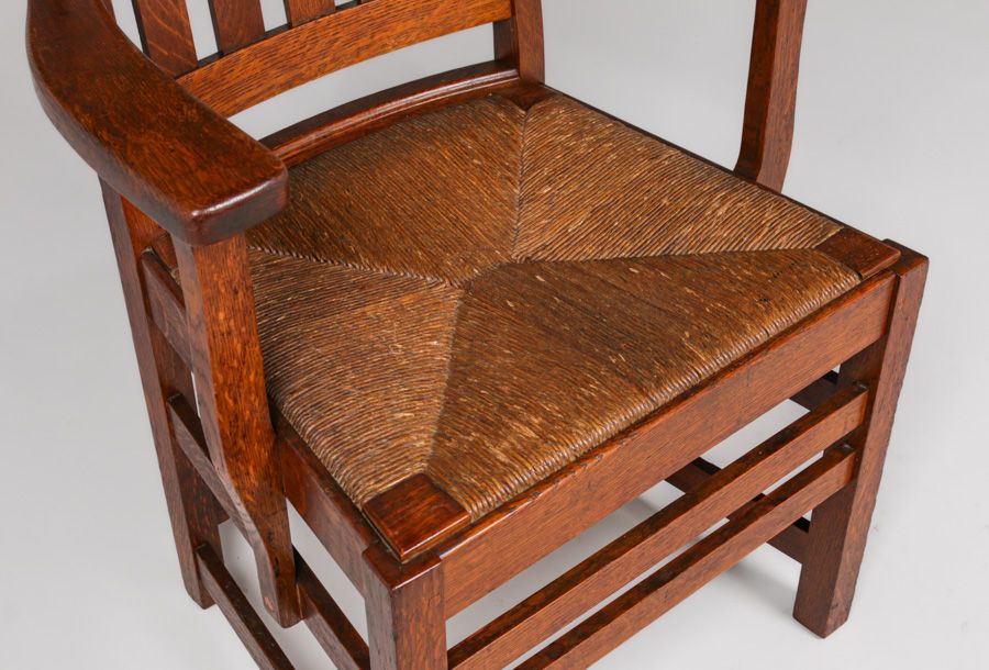 Limbert Set of 6 Oak Dining Chairs c1910. Signed with branded mark. Excellent original finish and original rush seats. Rock solid sturdy. Armchair36"h x 24"w x 20"d. Side Chairs 36.25"h x 17.75"w x 17"d