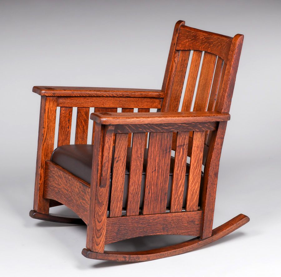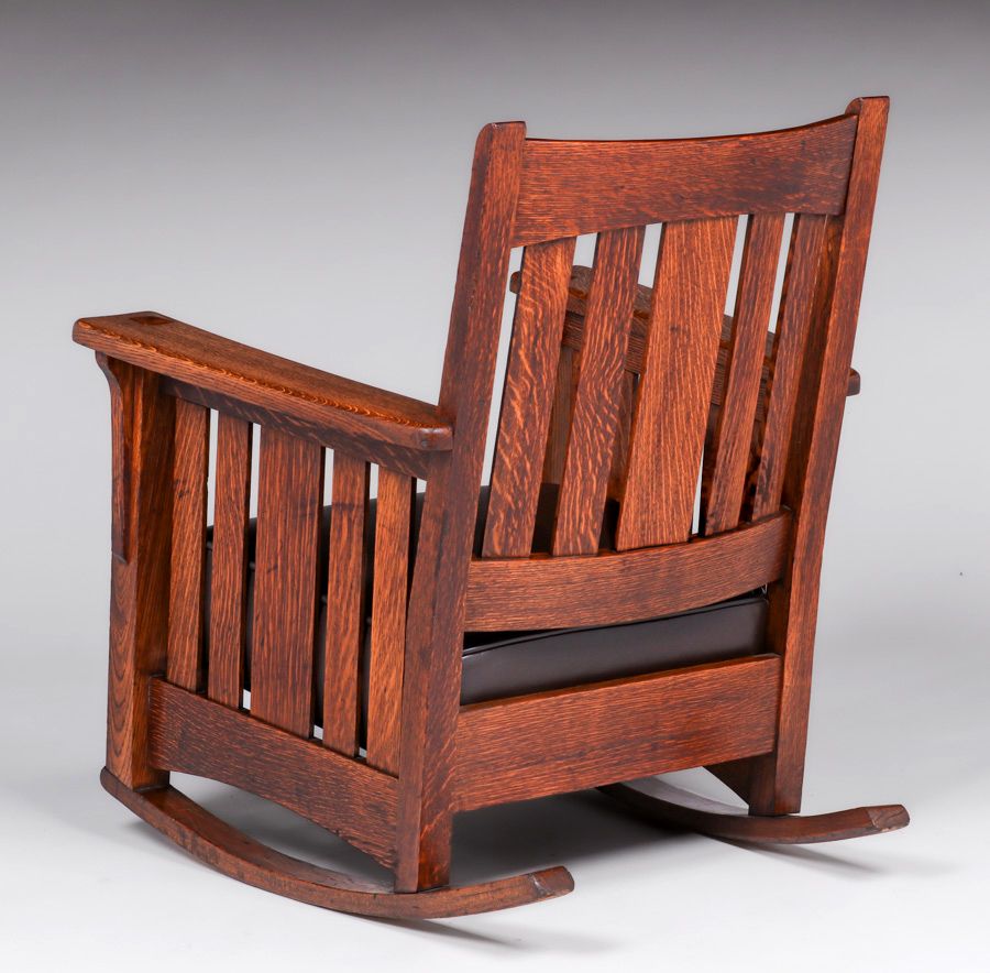 Limbert Slatted Rocker c1905. Unsigned. Very nicely refinished. 35″h x 29.5″w x 31″d SOLD