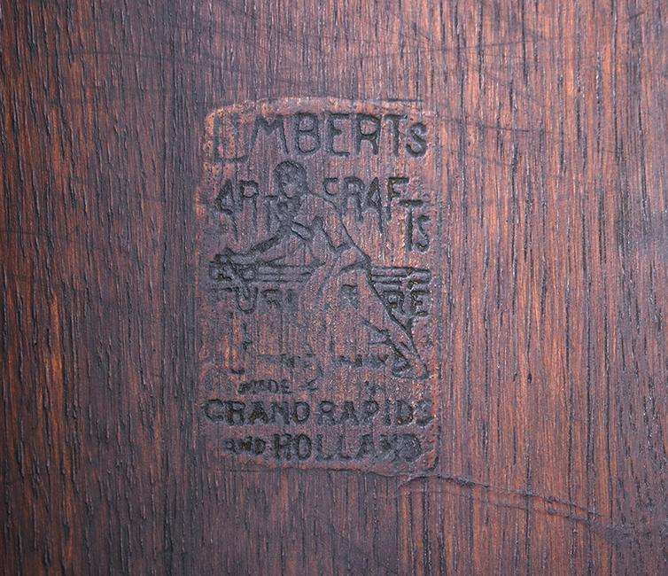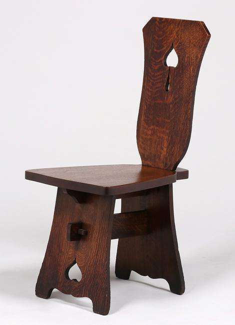 Limbert Spade Cutout Hall Chair c1910. Signed with branded mark. Surface of seat very nicely refinished to match original finish. 38.5"h x 17.5"w x 21"d SOLD