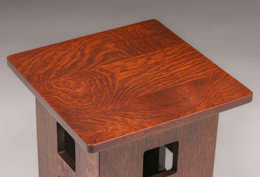 Limbert Square Cutout Taboret c1910. Signed with branded mark. Top refinished perfectly to match original finish base. 18″h x 16″ x 16″ SOLD