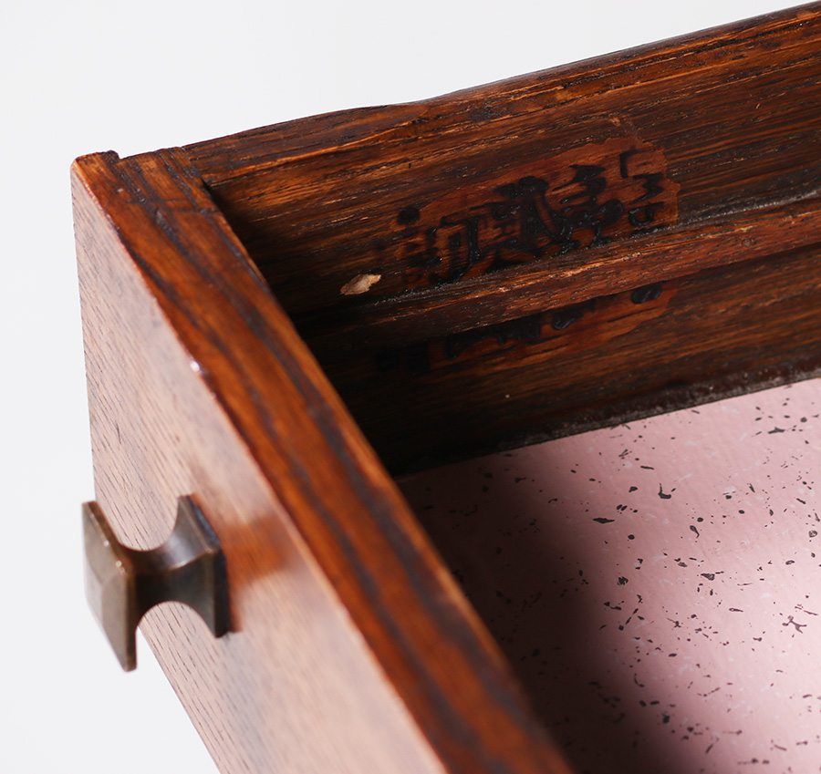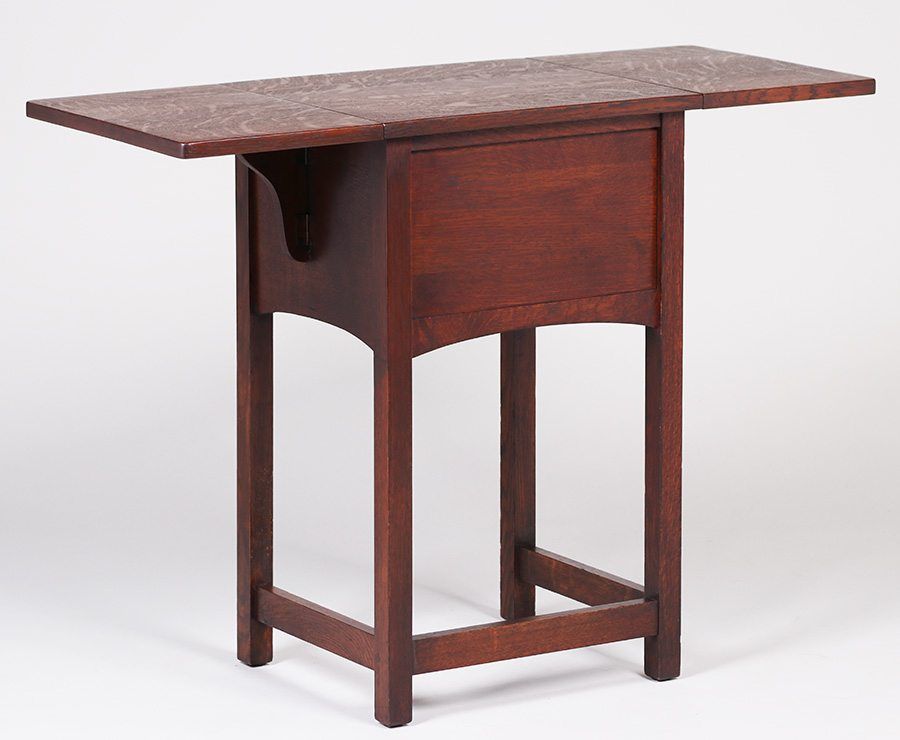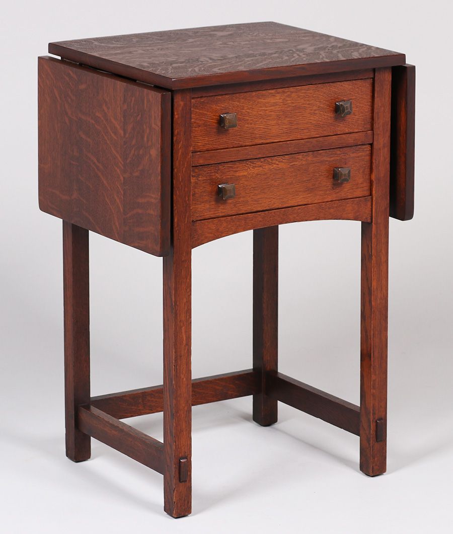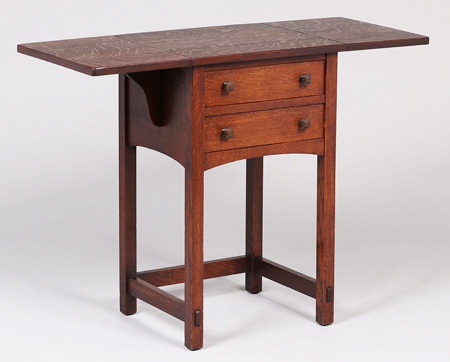 Limbert two-drawer drop-leaf side table. Signed. Top refinished, otherwise excellent original finish. 29″h x 17.75″w (38.5″w open) x 16″d SOLD