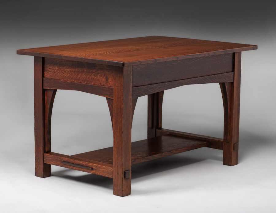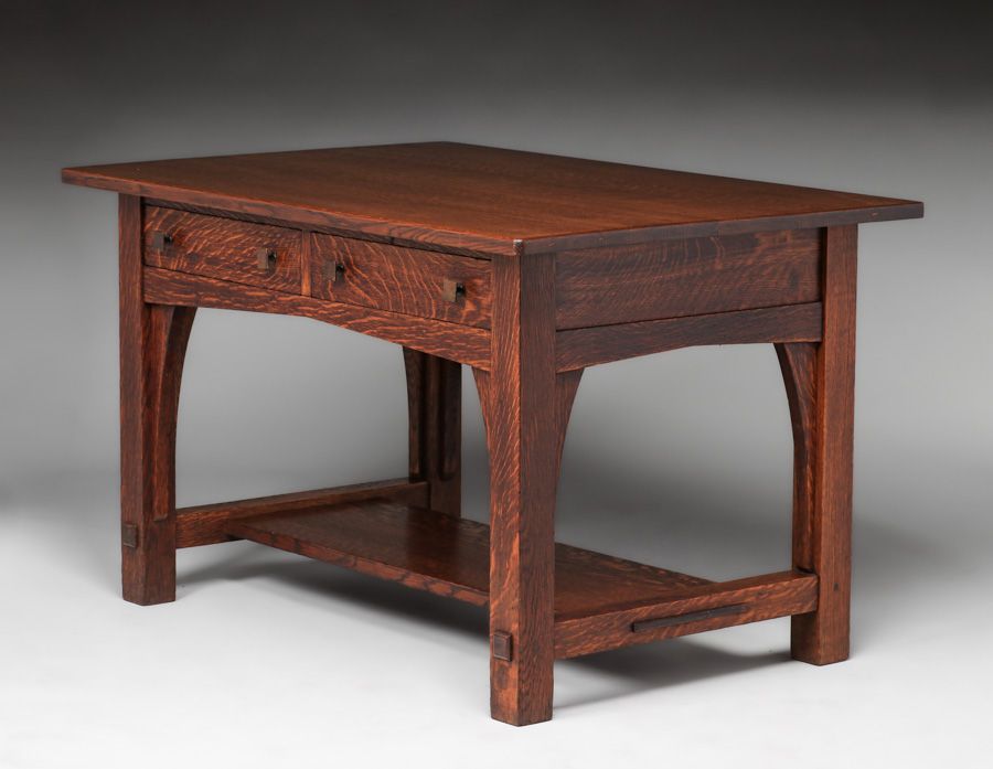 Limbert Two-Drawer Library Table c1910. Signed with branded mark. Top refinished perfectly to match original finish. 48"w x 32"d x 29"h SOLD