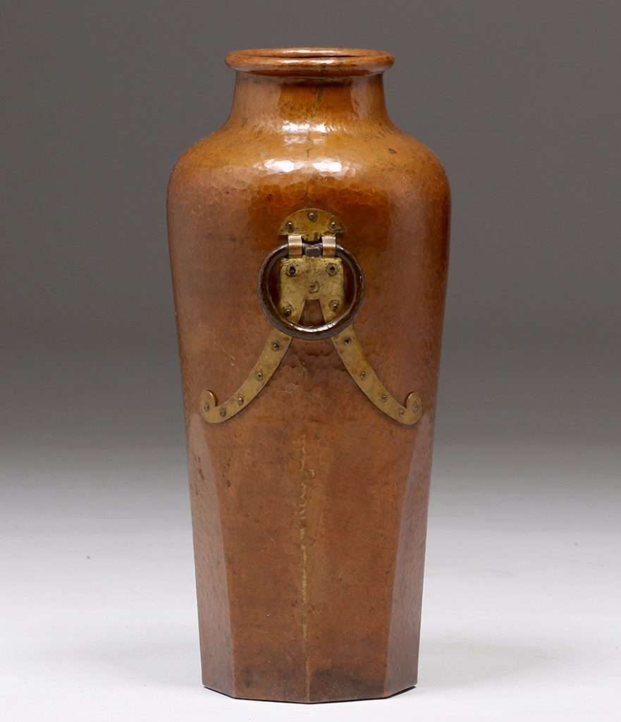 Rare Limbert Hammered Copper & Brass Two-Handled Vase Eight-Sided Base c1910. Unsigned. These specific handles are shown on Limbert lamp bases in both the Terry Seger Collection and Don Marek Grand Rapids Metalwork book. Excellent original patina. 13.5"h x 5.5"d SOLD
