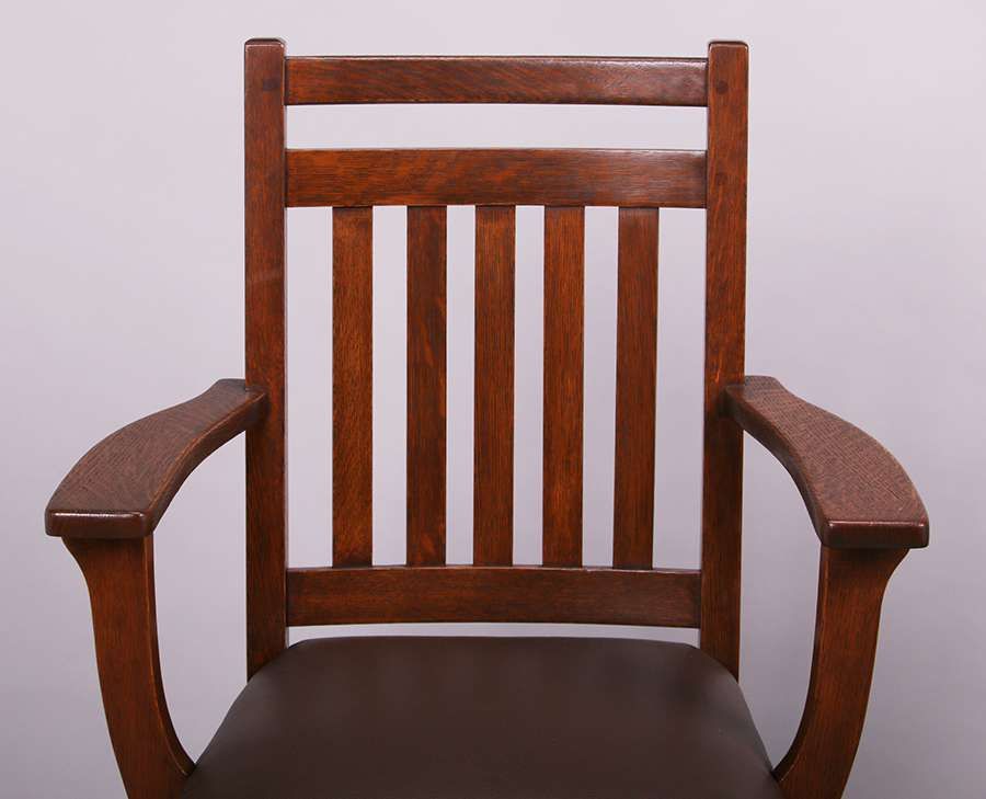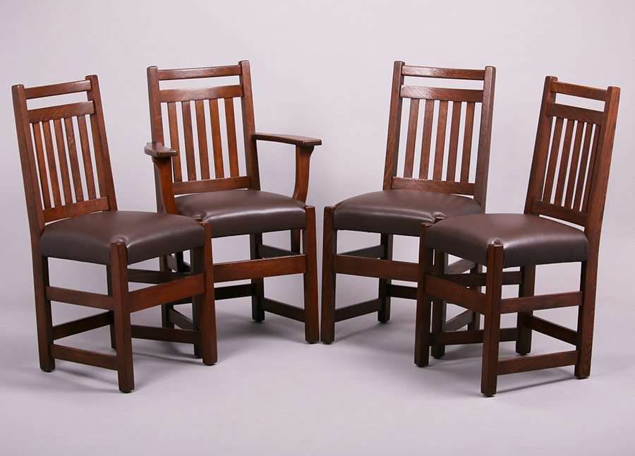 Set of 4 Limbert dining chairs with five vertical slats in back. Signed with branded mark. Refinished. Armchair measures 36.5"h x 23.5"w x 20"d. Side chairs each measure 36.5"h x 17.5"w x 17"d SOLD