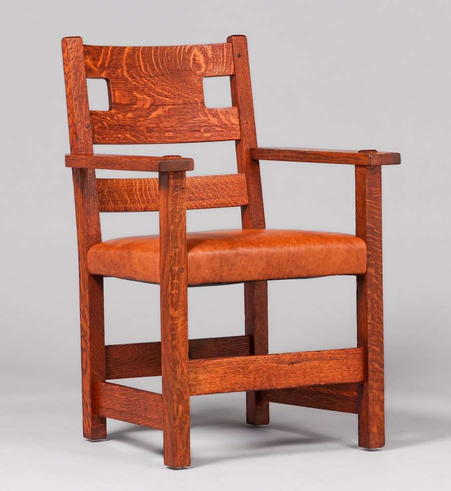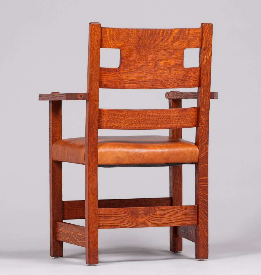 Set of 6 Limbert Cutout Dining Chairs c1910. Very rare to find a complete set of this cutout form. Signed with branded mark. Overcoated original finish. Rock solid sturdy. Armchair 36"h x 24.25"w x 20"d. Side chairs 34.75"h x 17.75"w x 16"d SOLD