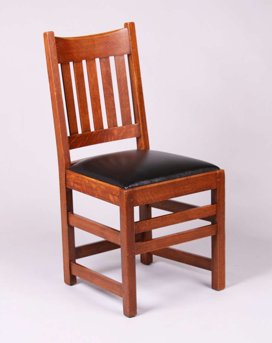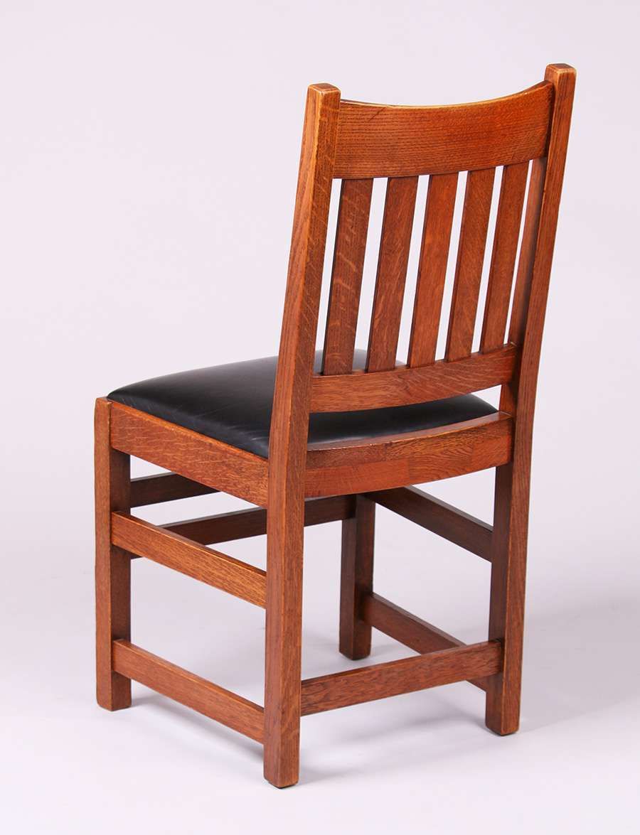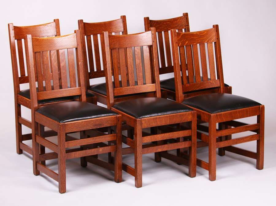 Set of 6 Limbert Dining Chairs with five vertical slats. Original finish. Signed with branded mark. 36.5"h x 17.5"w x 17"d SOLD