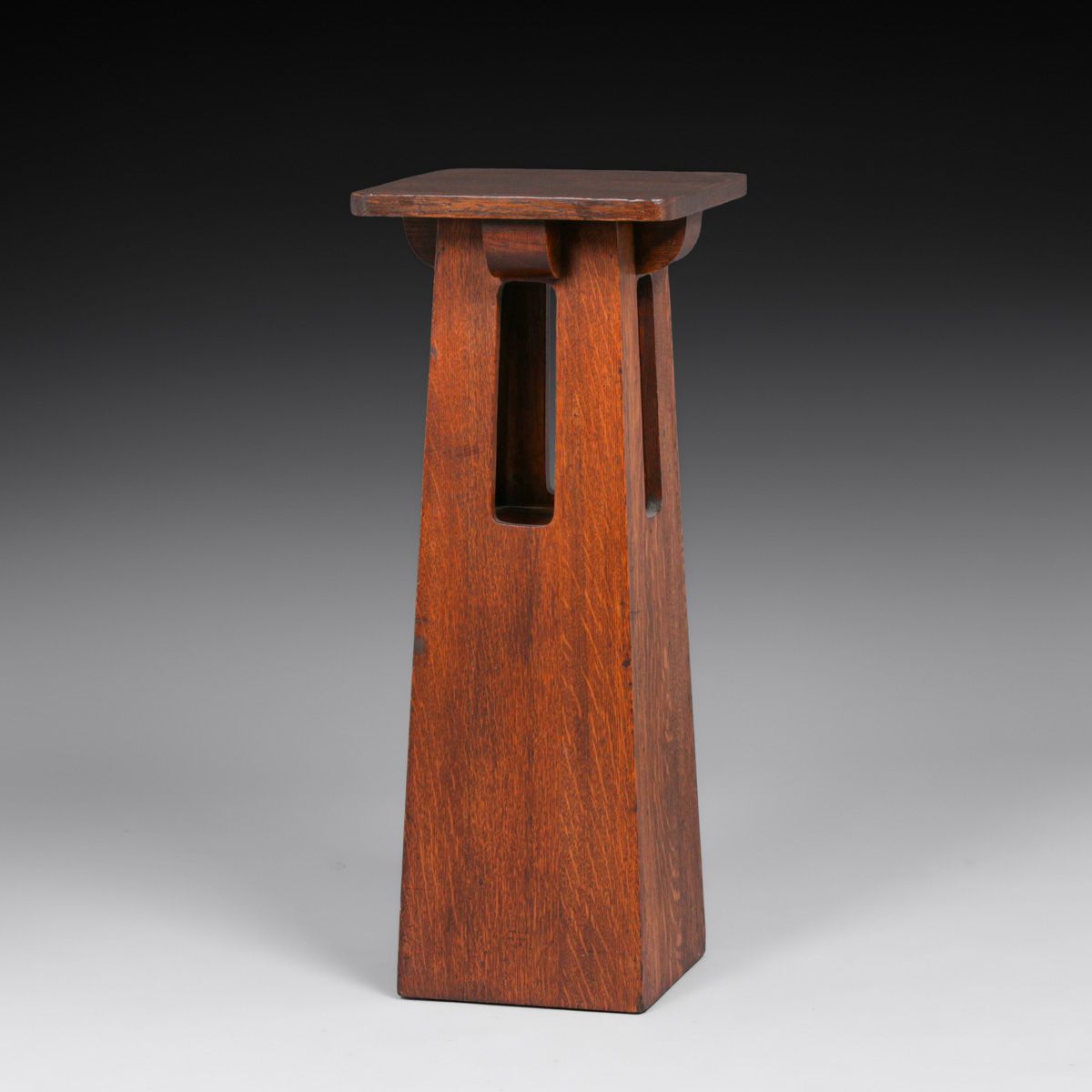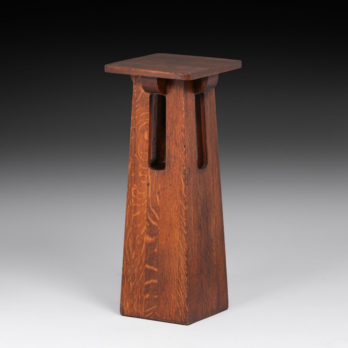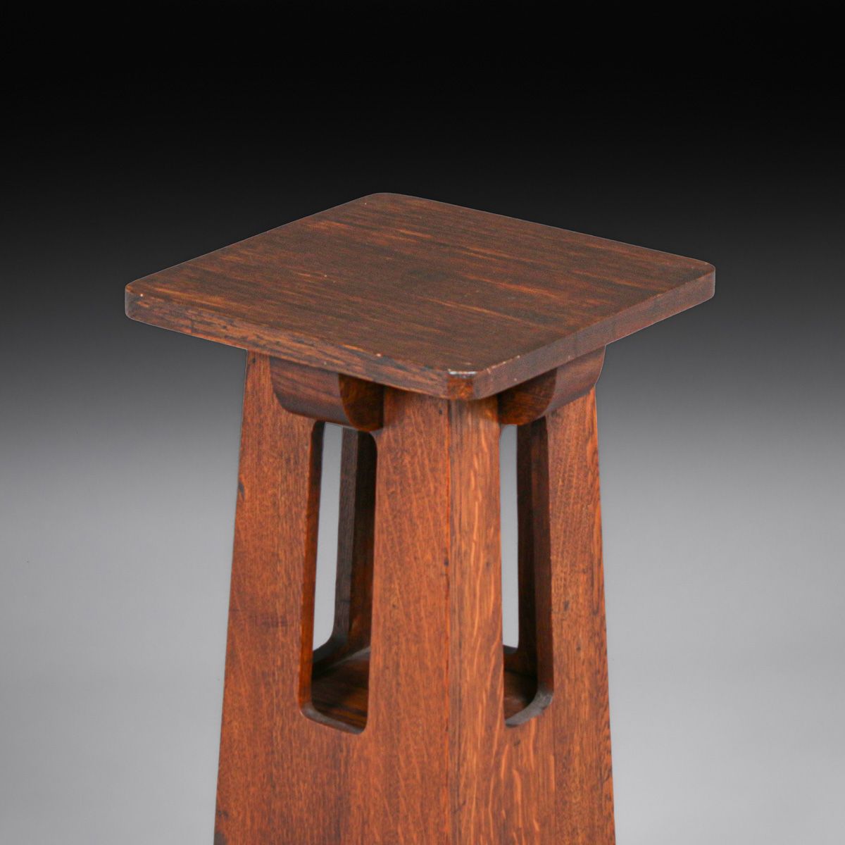 Early Limbert Cutout Cutout Pedestal c1905. Unsigned. Small 0.5"d plug in top center. Top refinished, base has excellent original finish. Extremely rare form that has not surfaced in over 30 years. 35.5"h x 14.25" x 14.25"