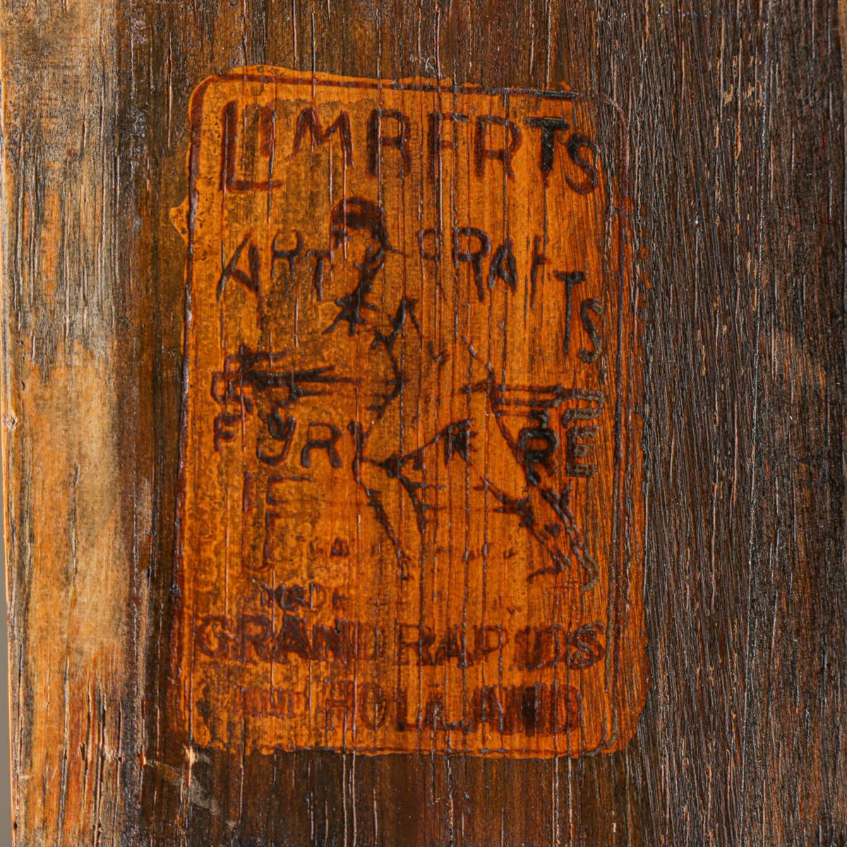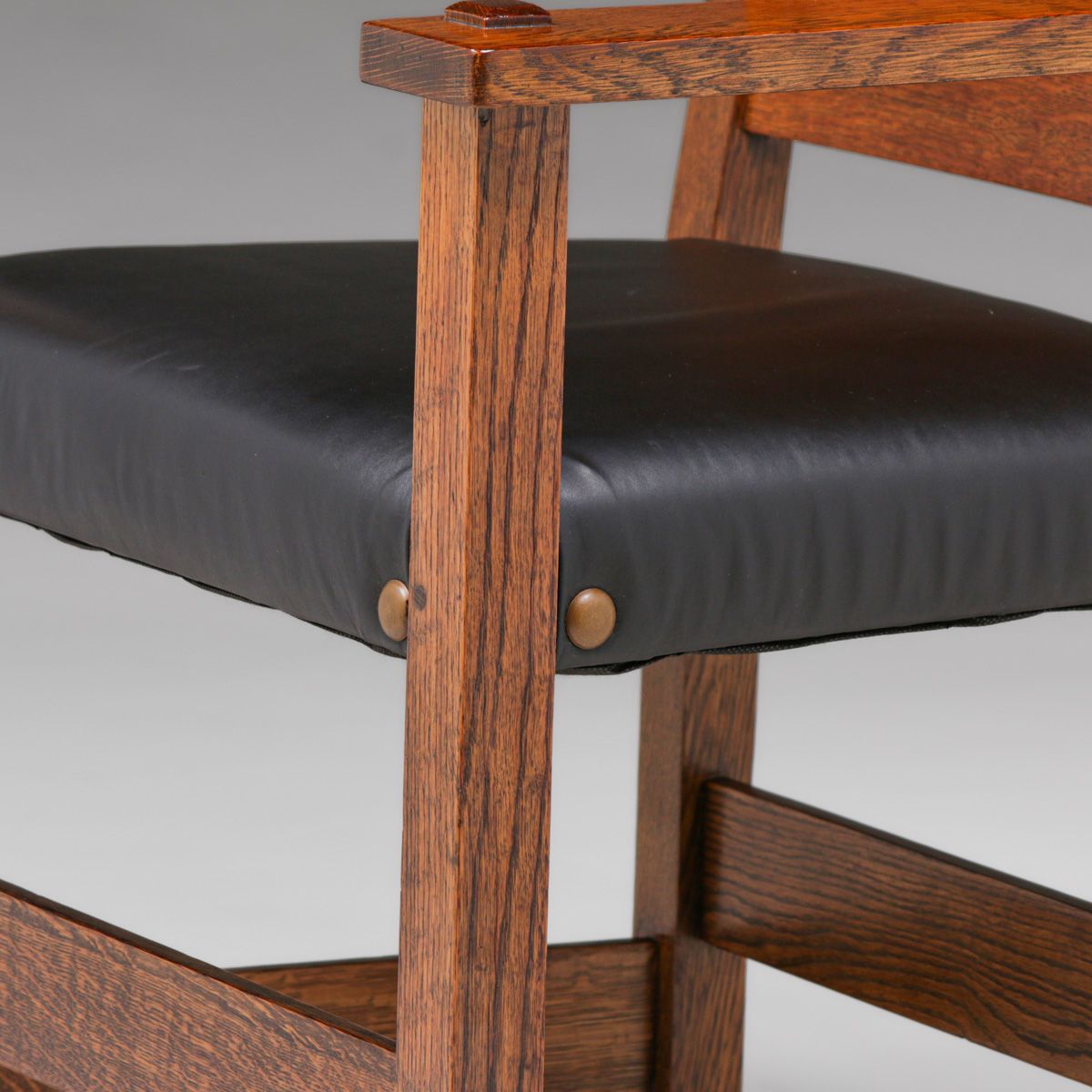 Limbert #593 Cutout Oak Armchair c1910. Signed with branded mark. Very nice old refinish. Rock solid sturdy. 35.5"h x 24.5"w x 20"d
