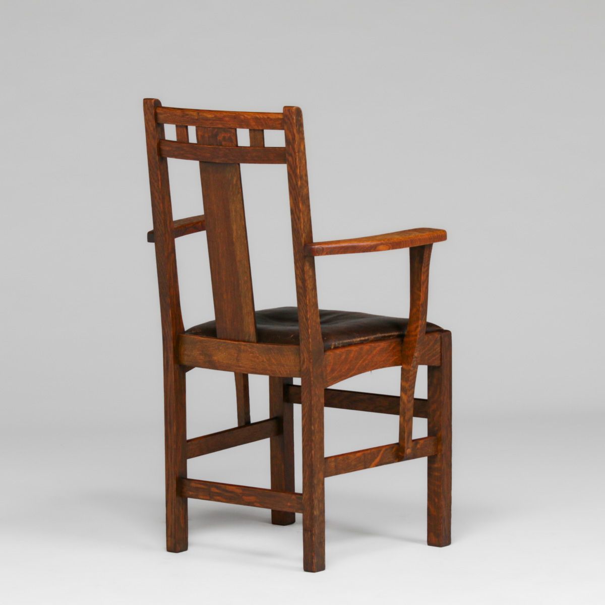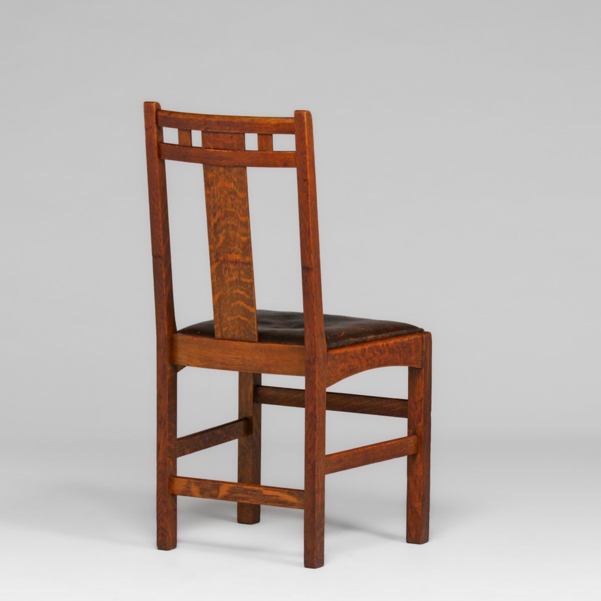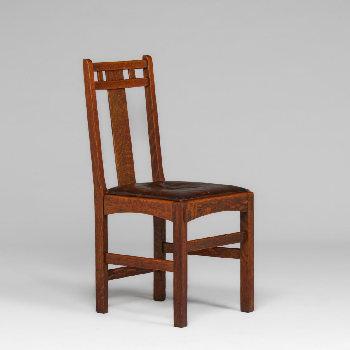Limbert Set of 6 Dining Chairs c1910. Unsigned. Excellent original finish and original leather seats. Rock solid sturdy. sidechair: 36.75"h x 17.75"w x 19.25"d Armchair: 36.75"h x 23.5"w x 19.25"d