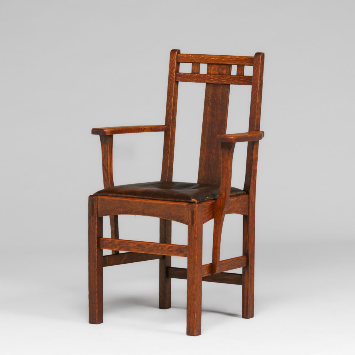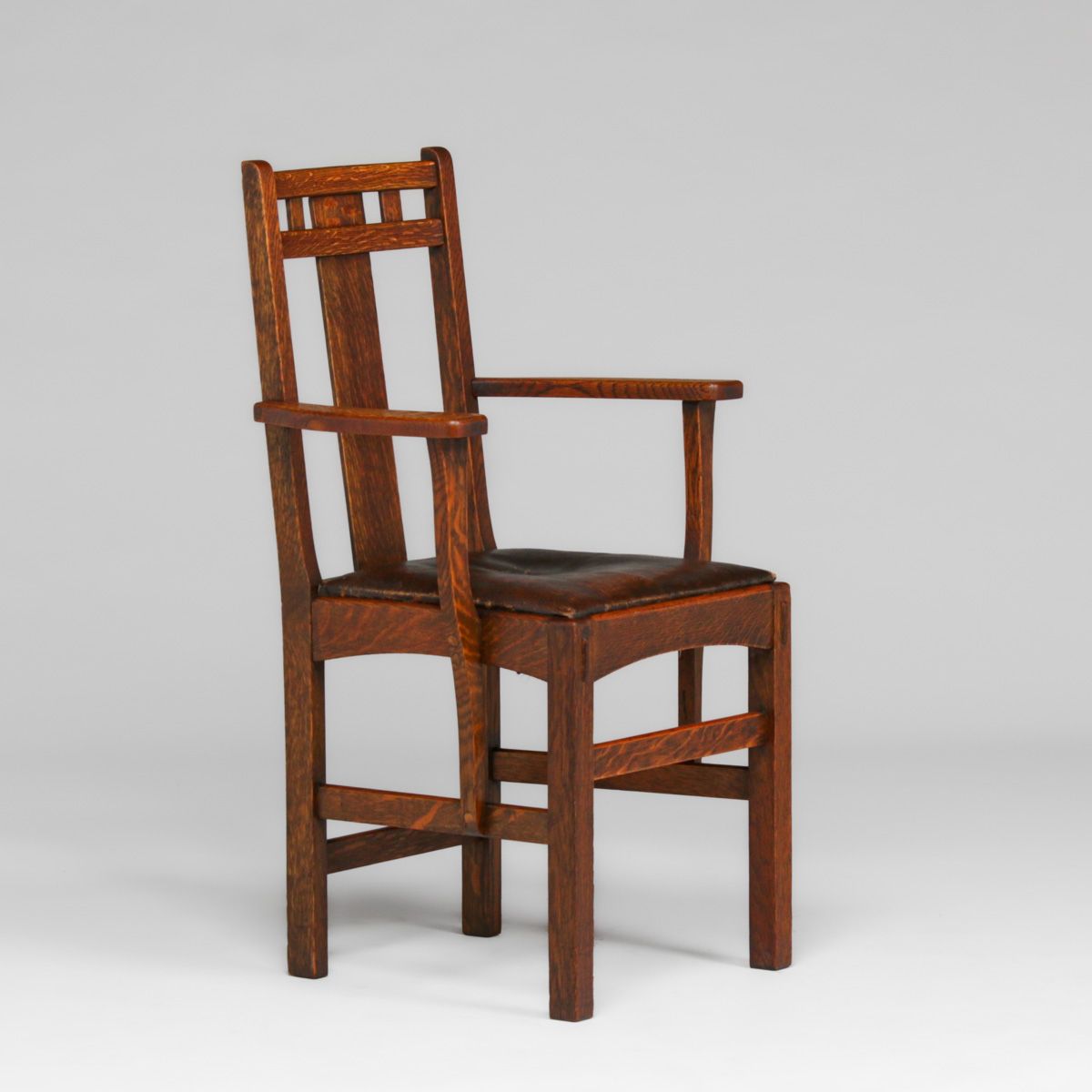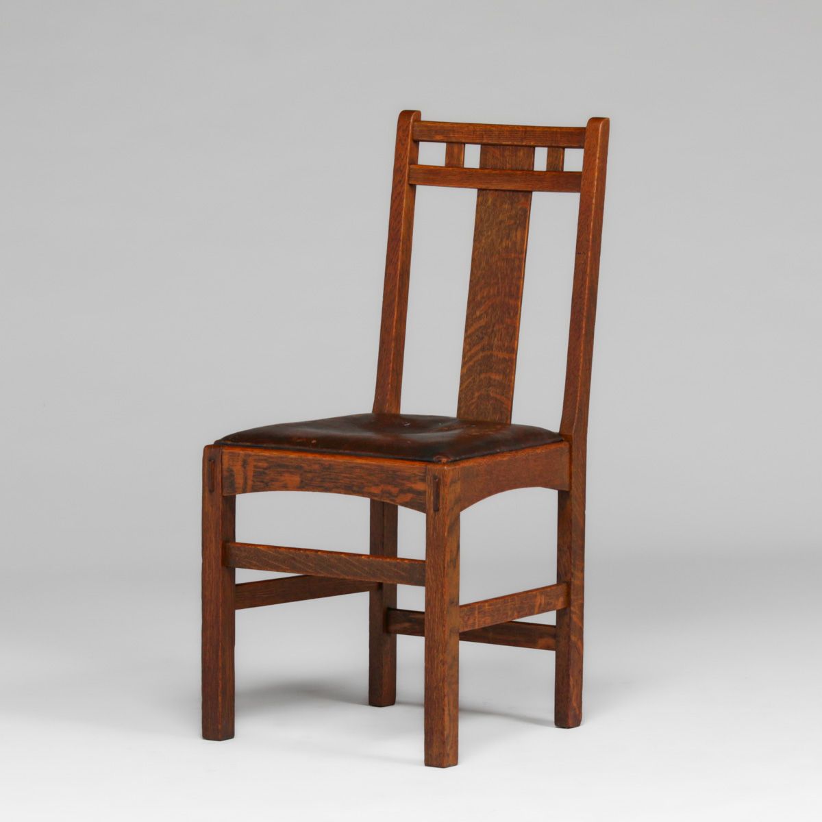 Limbert Set of 6 Dining Chairs c1910. Unsigned. Excellent original finish and original leather seats. Rock solid sturdy. sidechair: 36.75"h x 17.75"w x 19.25"d Armchair: 36.75"h x 23.5"w x 19.25"d