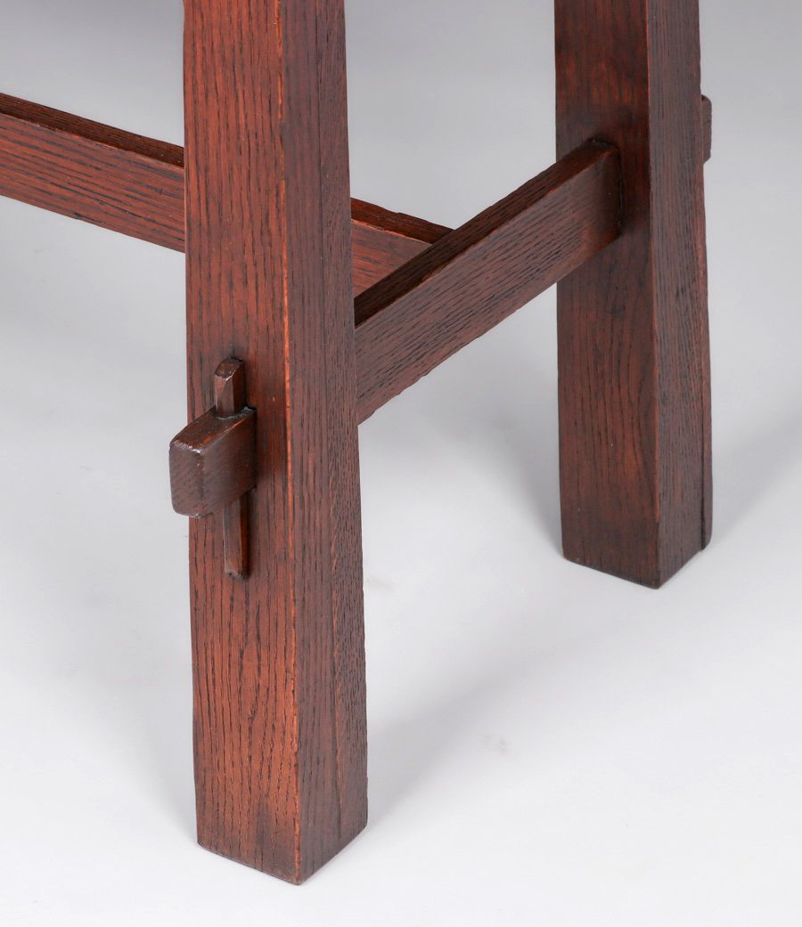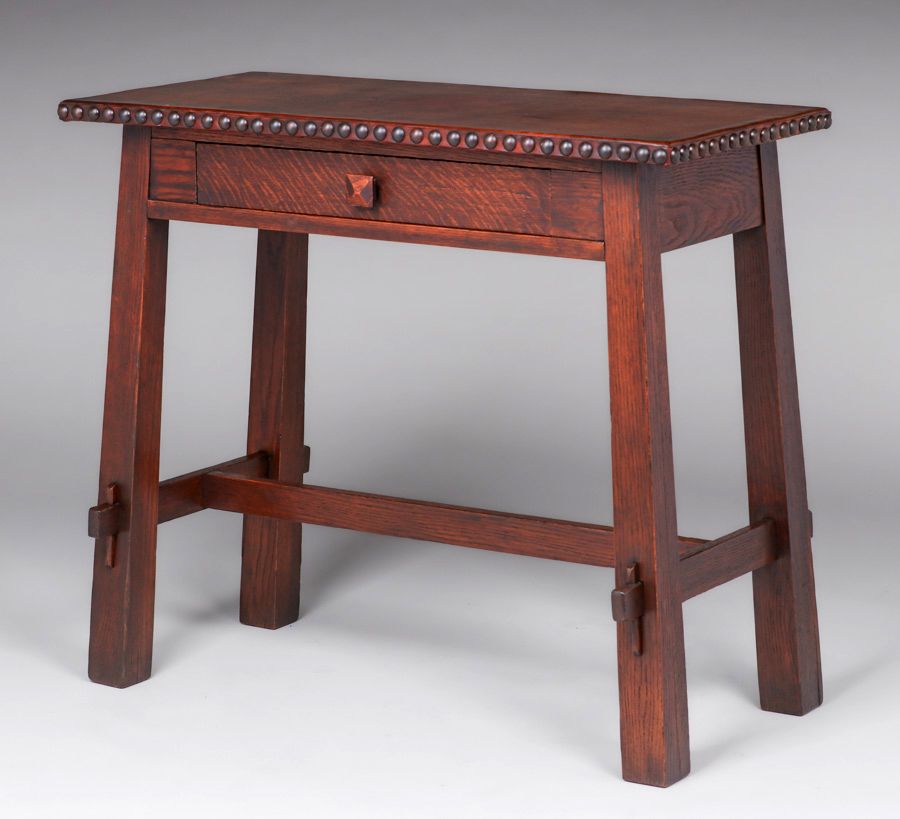 Early L&JG Stickley Onondaga One-Drawer Reverse-Tapered Leather-Top Side Table c1902. Unsigned. New leather. Excellent original finish. 34.5"w x 30"h x 16.75"d SOLD