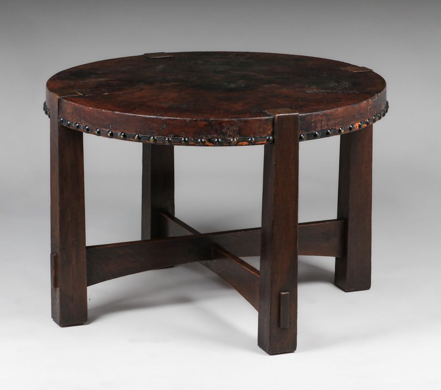 Early L&JG Stickley Onondaga Reverse-Tapered Leather-Top Table c1902. In 1901 Gustav Stickley first designed this form. Leopold and John George had been working for their older brother Gustav at United Crafts. By 1902, they had formed their own company, The Onondaga Shops (with Gustav's blessing). They copied a number of Gustav Stickley's successful designs, changing them just slightly to differentiate themselves. Unsigned. Excellent original finish and original leather. 43"d x 29.5"h SOLD
