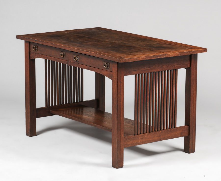 - Early L&JG Stickley Onondaga Spindled Leather-Top Two-Drawer Library Table c1902-1904