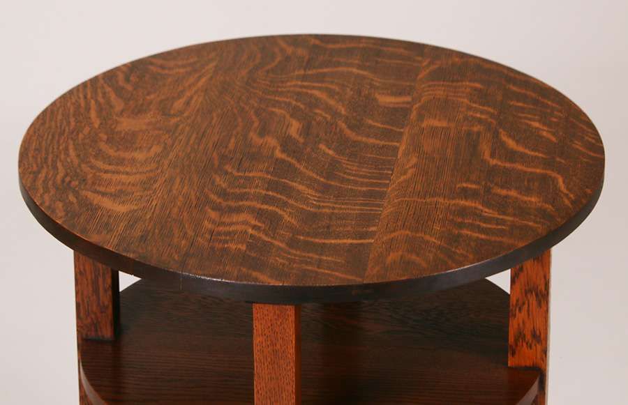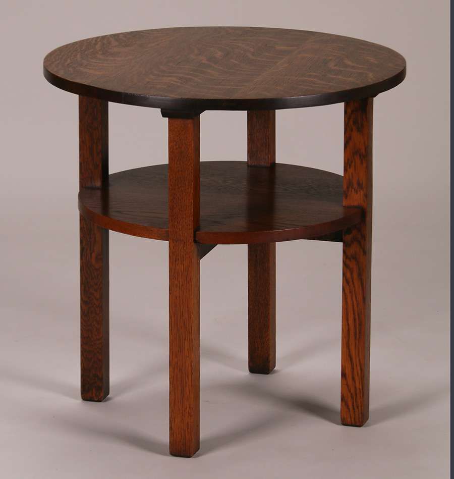 L&JG Stickley 24"d lamp table. Unsigned. Refinished. Very nice example of this form. 24"h x 24"d SOLD