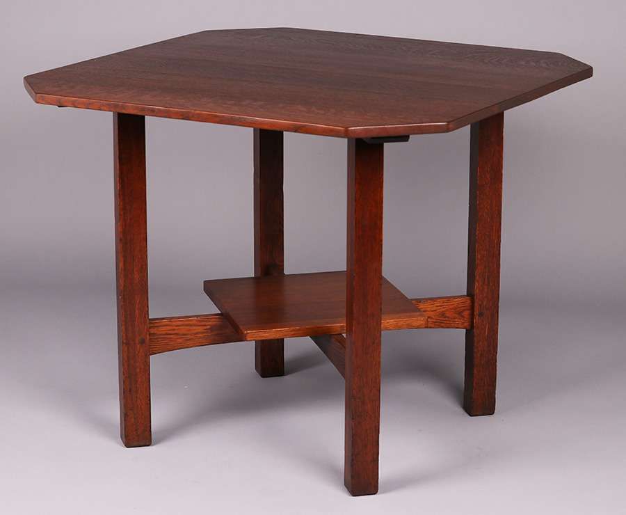 Large L&JG Stickley clip-corner table table. Signed "L&JG Stickley Handcraft". Top refinished. Base has its original finish. 36" x 36" x 29"h SOLD