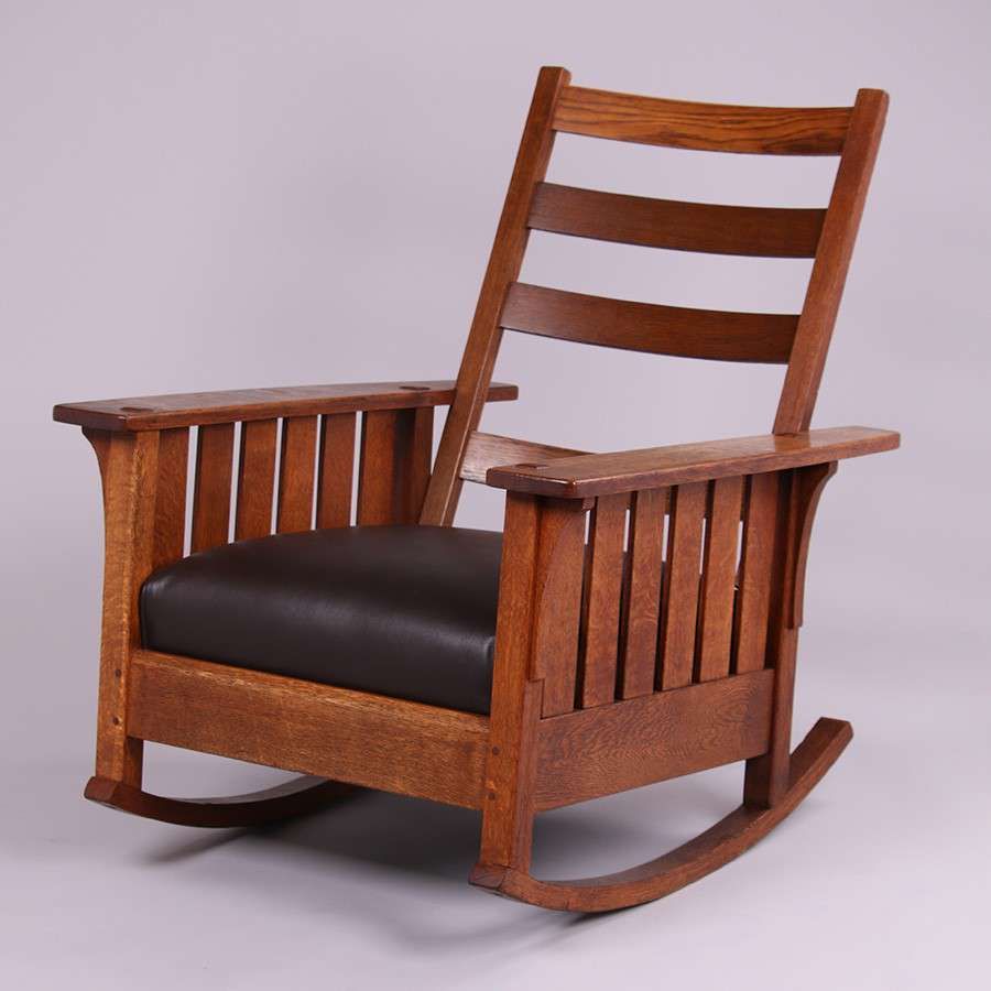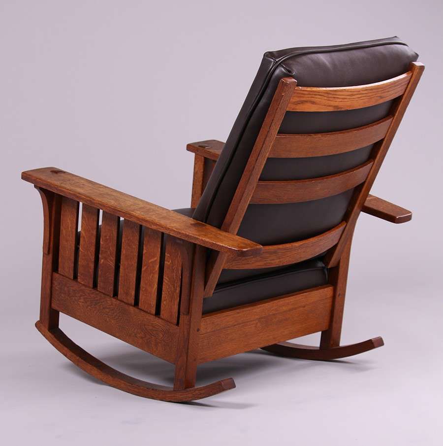 L&JG Stickley #475 Fixed-Back Slatted Rocker. Excellent original medium brown finish. Signed. 39"h x 31.5"w x 35"d SOLD