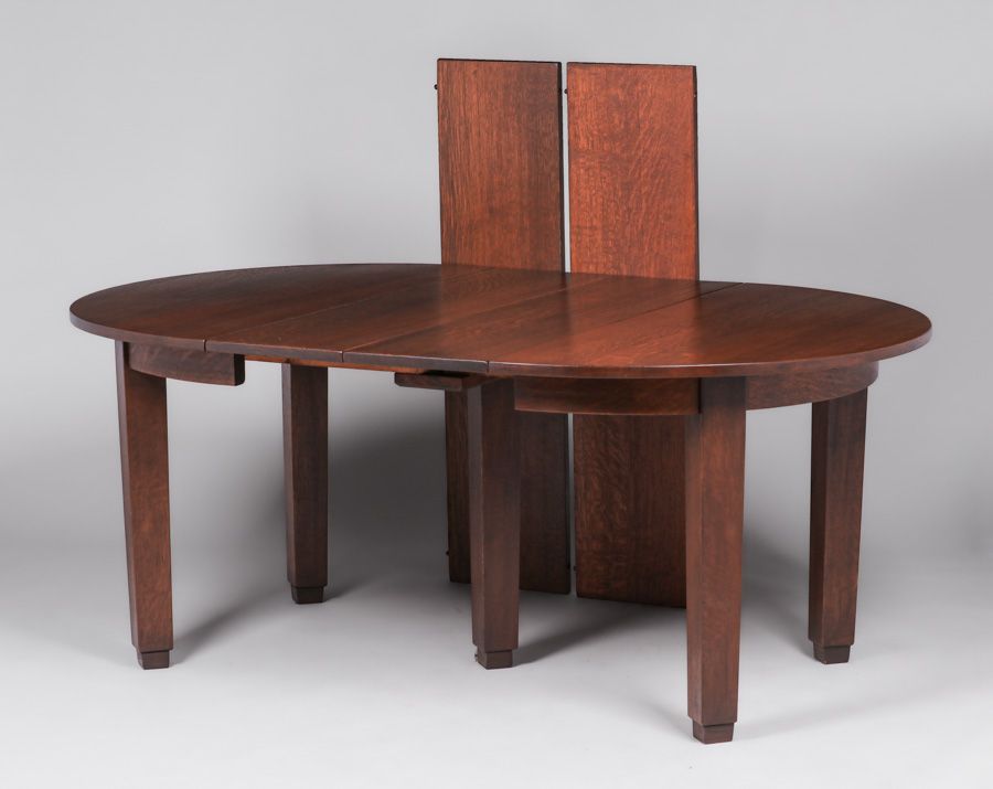 L&JG Stickley 48"d Five-Leg Dining Table c1910. Includes four 12"w original leaves. Unsigned. Very nicely refinished. 48"w x 29.75"h (extends to 96"w x 48") $5500