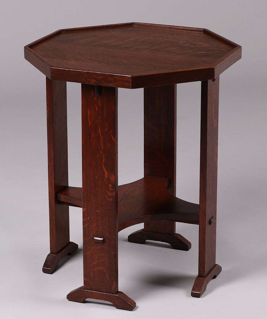 Rare L&JG Stickley octagonal side table #515. Signed. Top refinished, base has its original finish. 24.5″h x 20″ x 20″ SOLD