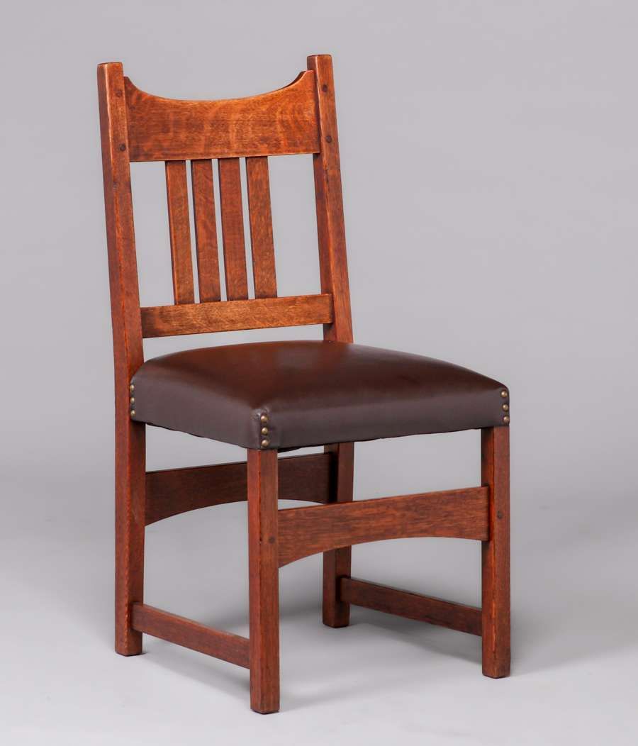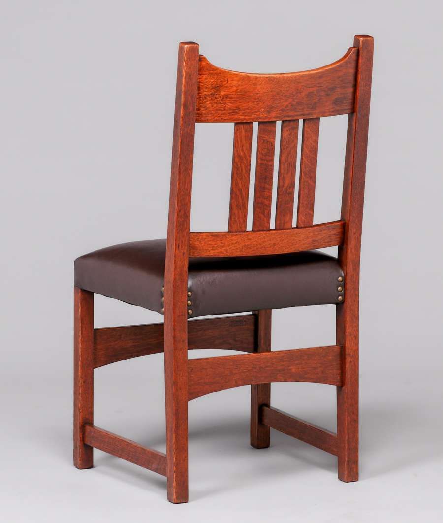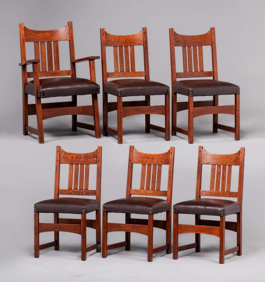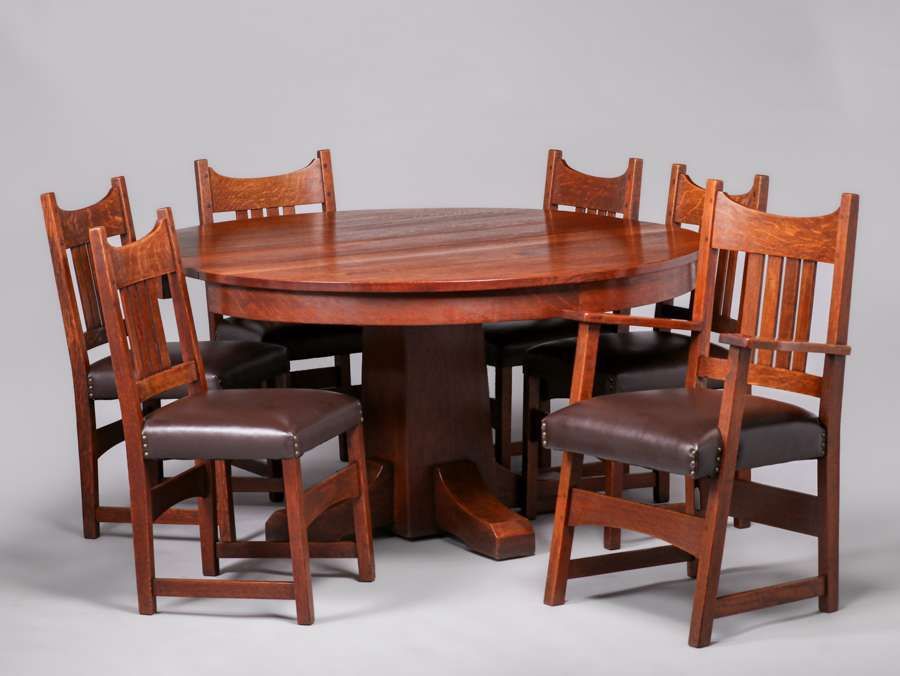 L&JG Stickley 54"d Dining Table & 6 Chairs c1910. Four original 11.25"w leaves in original crate. Signed. Excellent original finish. Chairs rock solid sturdy. Table 54"d x 30" (99" x 54" with leaves). Armchair 38”h x 26”w x 19”d. Side Chairs 36”h x 18”w x 17”d SOLD