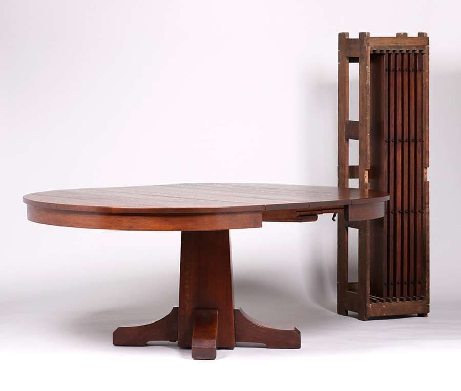 - L&JG Stickley 54"d Dining Table with 8 Original Leaves c1907-1912