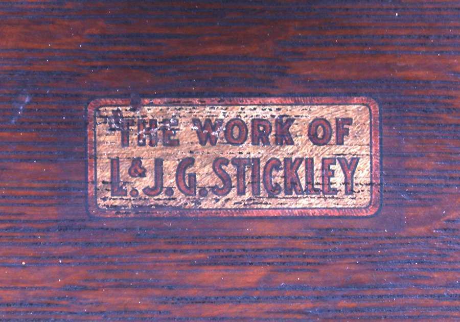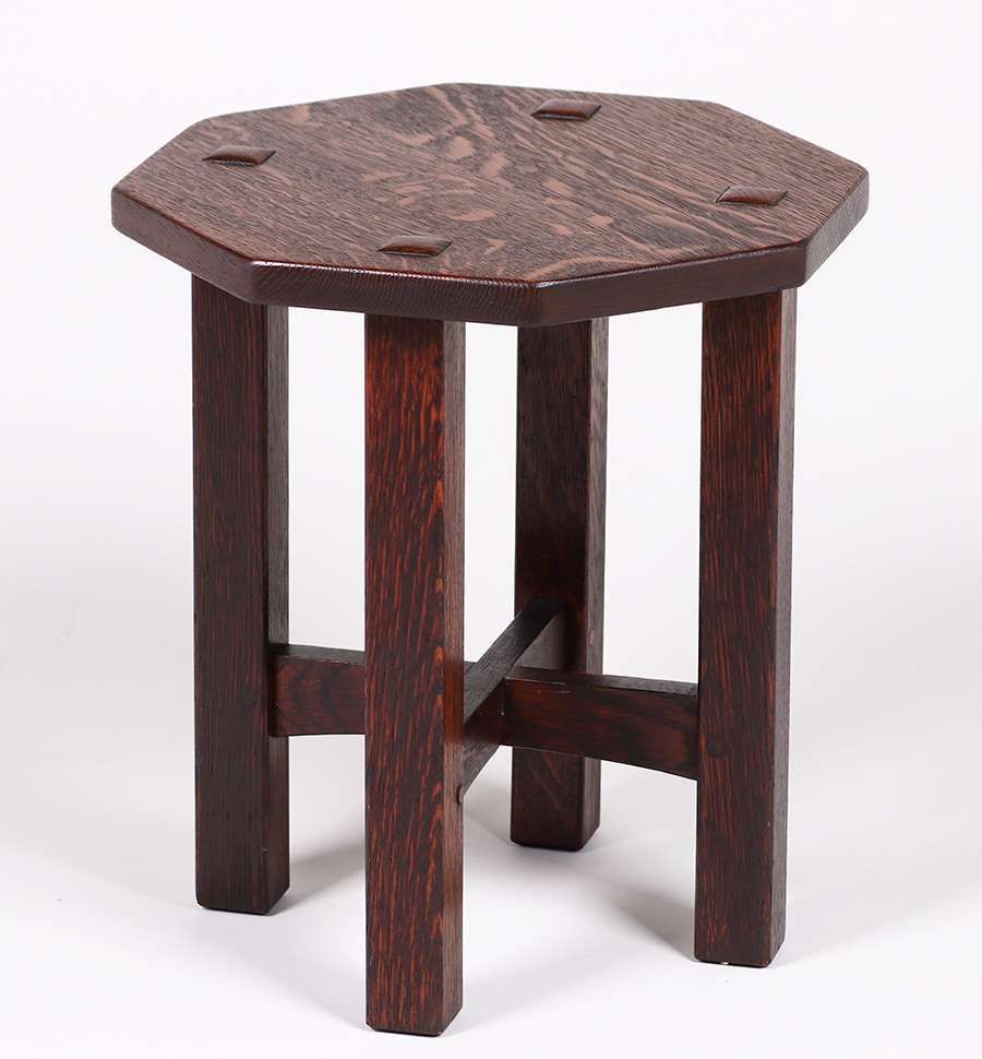 L&JG Stickley #558 taboret c1908-1912. Signed. Top refinished perfectly to match original finish base. 17"h x 15"d SOLD