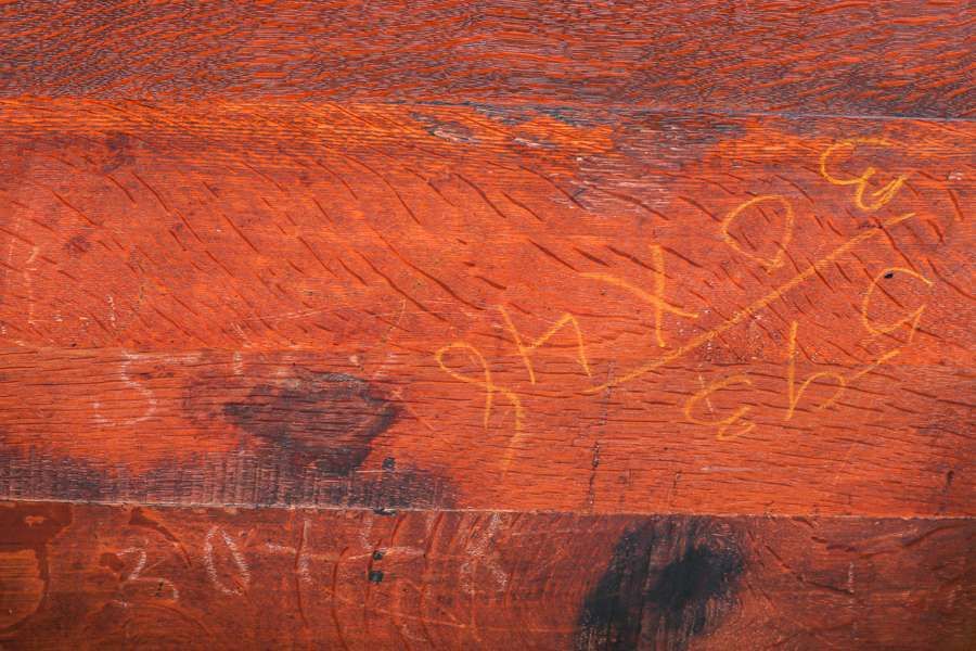 L&JG Stickley #593 Trestle Table c1910. Unsigned except chalk marked "593". 48"w x 30"d x 29"h SOLD