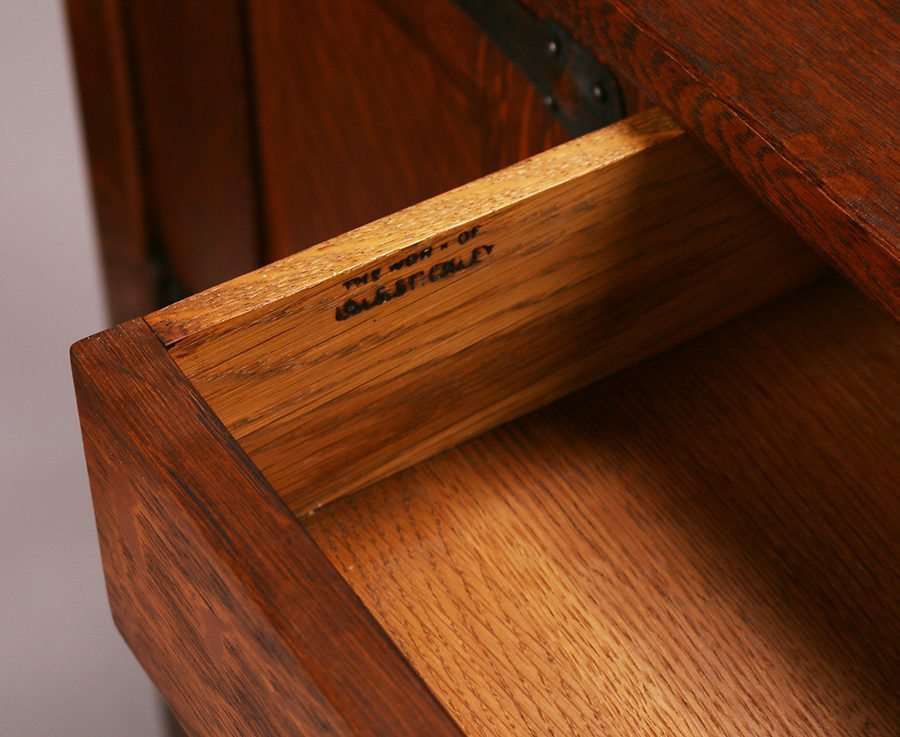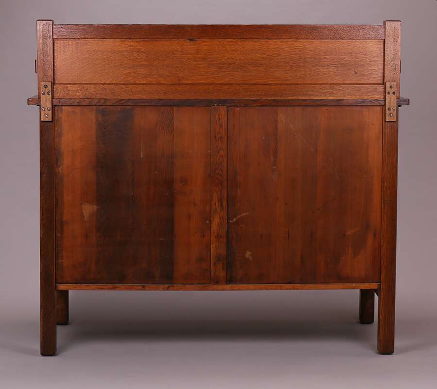 L&JG Stickley heavy strap-hinged sideboard. Signed. Refinished. 54″w x 48.25″h x 24.5″d SOLD