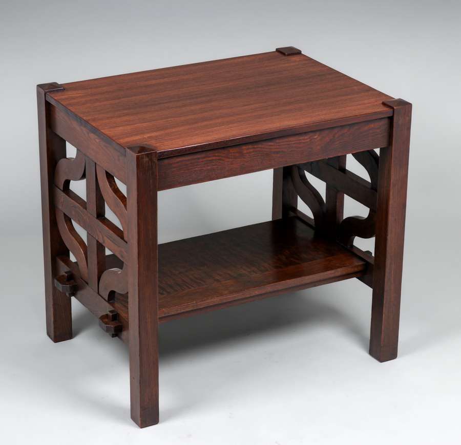 L&JG Stickley Onondaga Curved Slat Library Table c1902-1904. L&JG Stickley experimented with a line of these curved slat forms and they a quite rare. Unsigned. Very nicely refinished. 32″w x 24″d x 30″h $4500