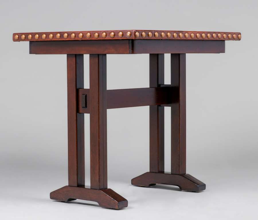 L&JG Stickley Onondaga Mahogany Leather-Top Table c1904. Perfect for a game table or small breakfast table. Unsigned. Nicely replaced leather. Excellent original finish. Very sturdy. 32”w x 29”d x 31”h SOLD
