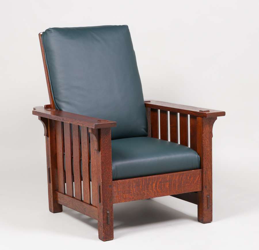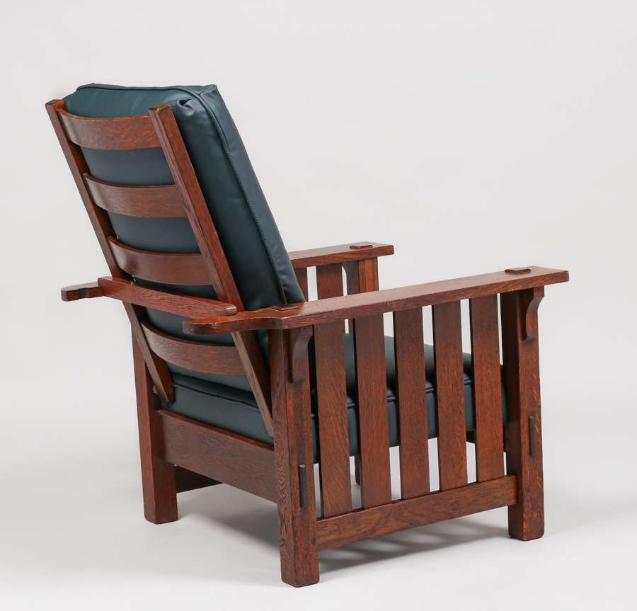 L&JG Stickley Onondaga Shops #498 Slatted Morris Chair c1904. Unsigned. Excellent original finish. 42.5"h x 32"w x 36.5"d SOLD