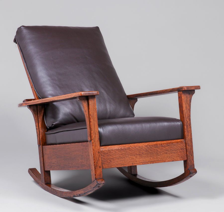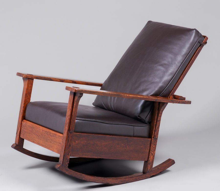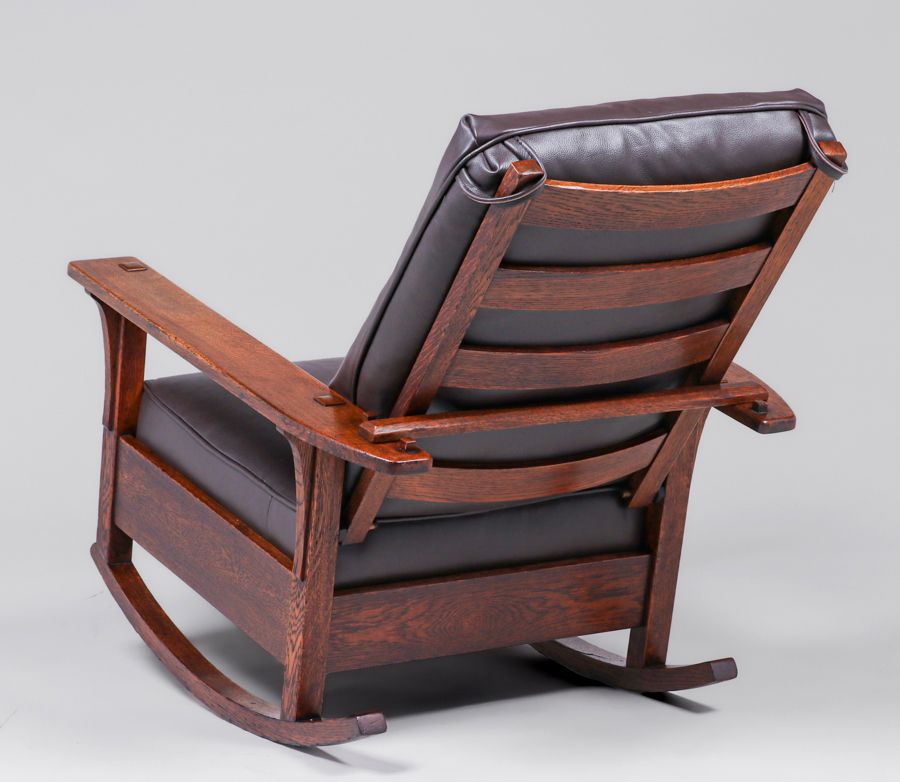 L&JG Stickley Open-Arm Morris Rocker c1912-1915. Signed with branded mark. Excellent original finish. 38"h x 29.5"w x 33"d $3500