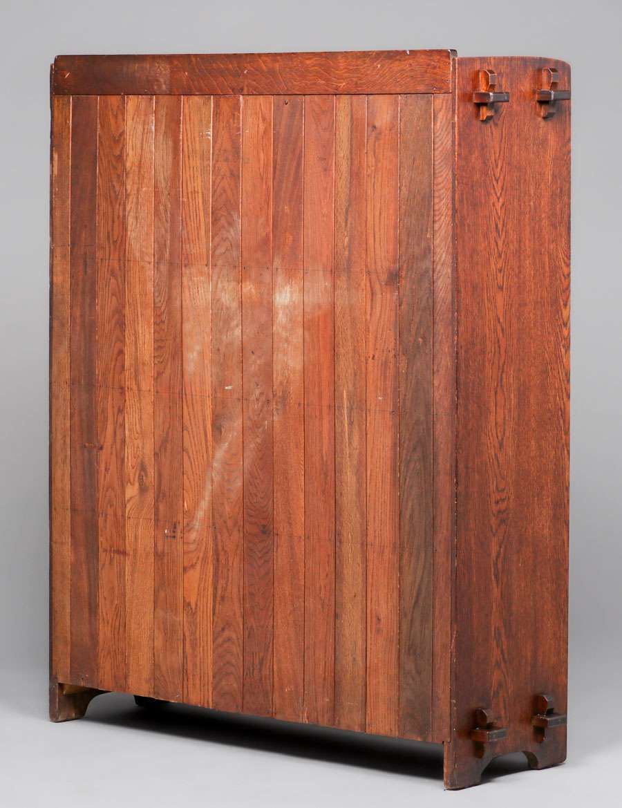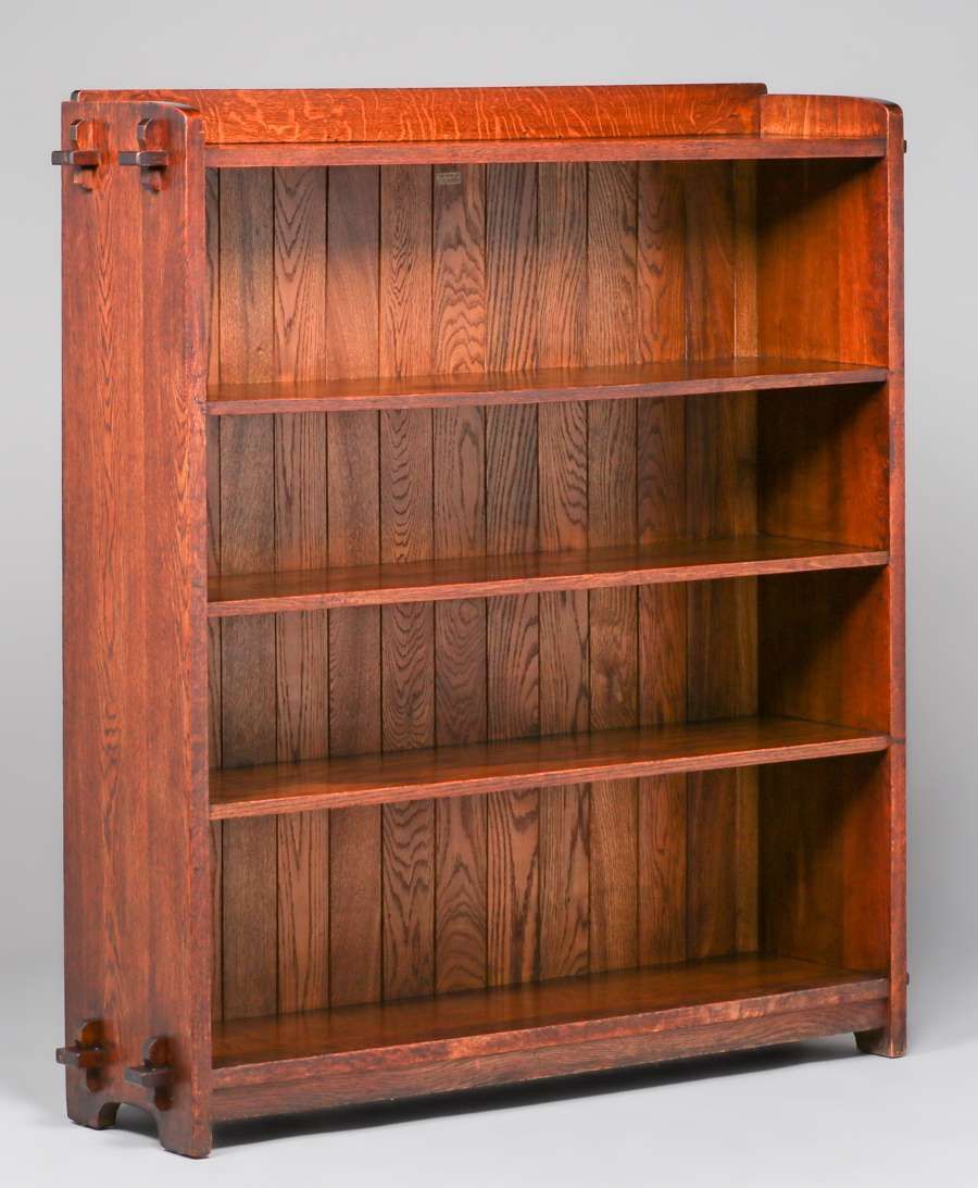 L&JG Stickley Open Bookcase c1908-1912. Chamfered board back and tenon & key construction. Signed. Excellent original finish. 55.25"h x 49"w (52.5" with tenons) x 12"d SOLD