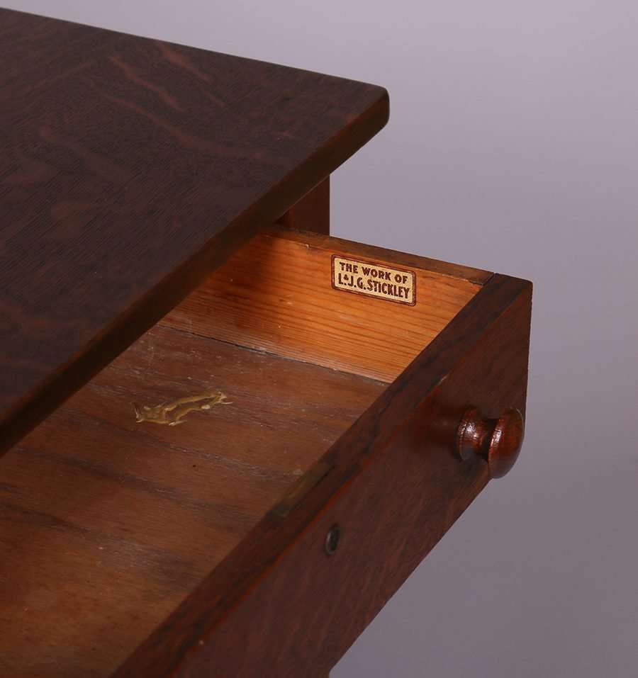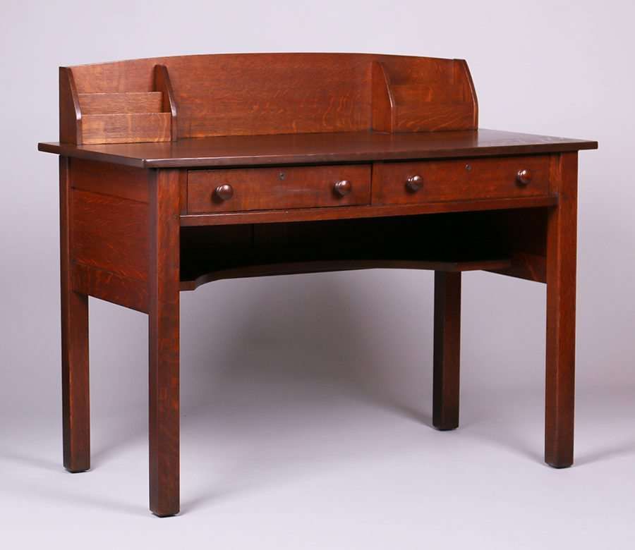 L&JG Stickley postcard desk with two drawers. Signed. Original finish except top surface refinished. 44"w x 21.25"d x 36.5"h SOLD
