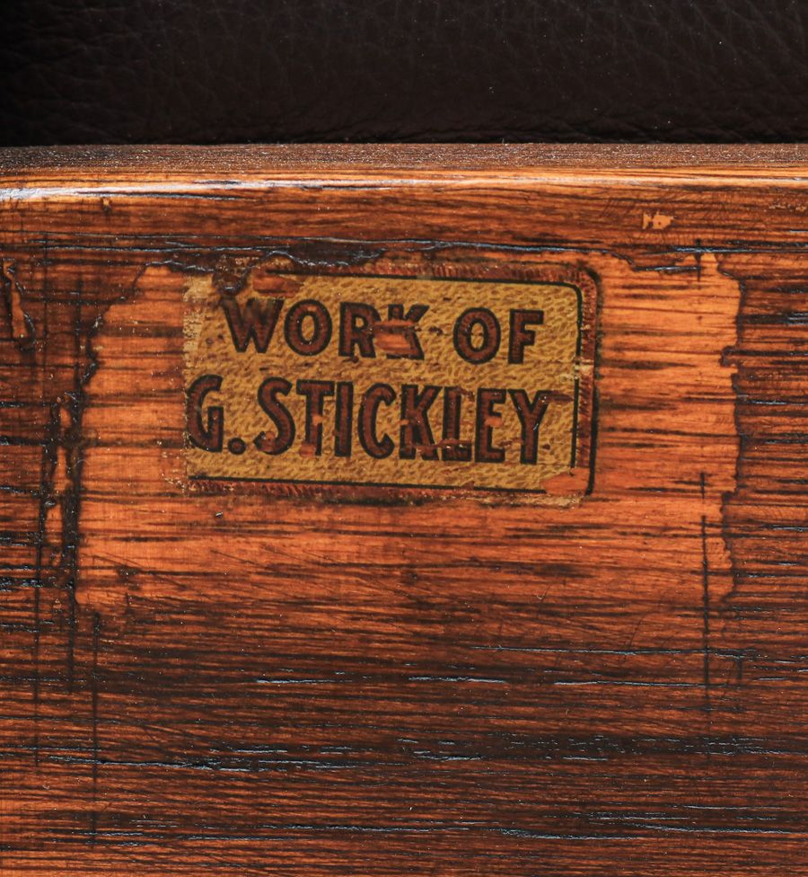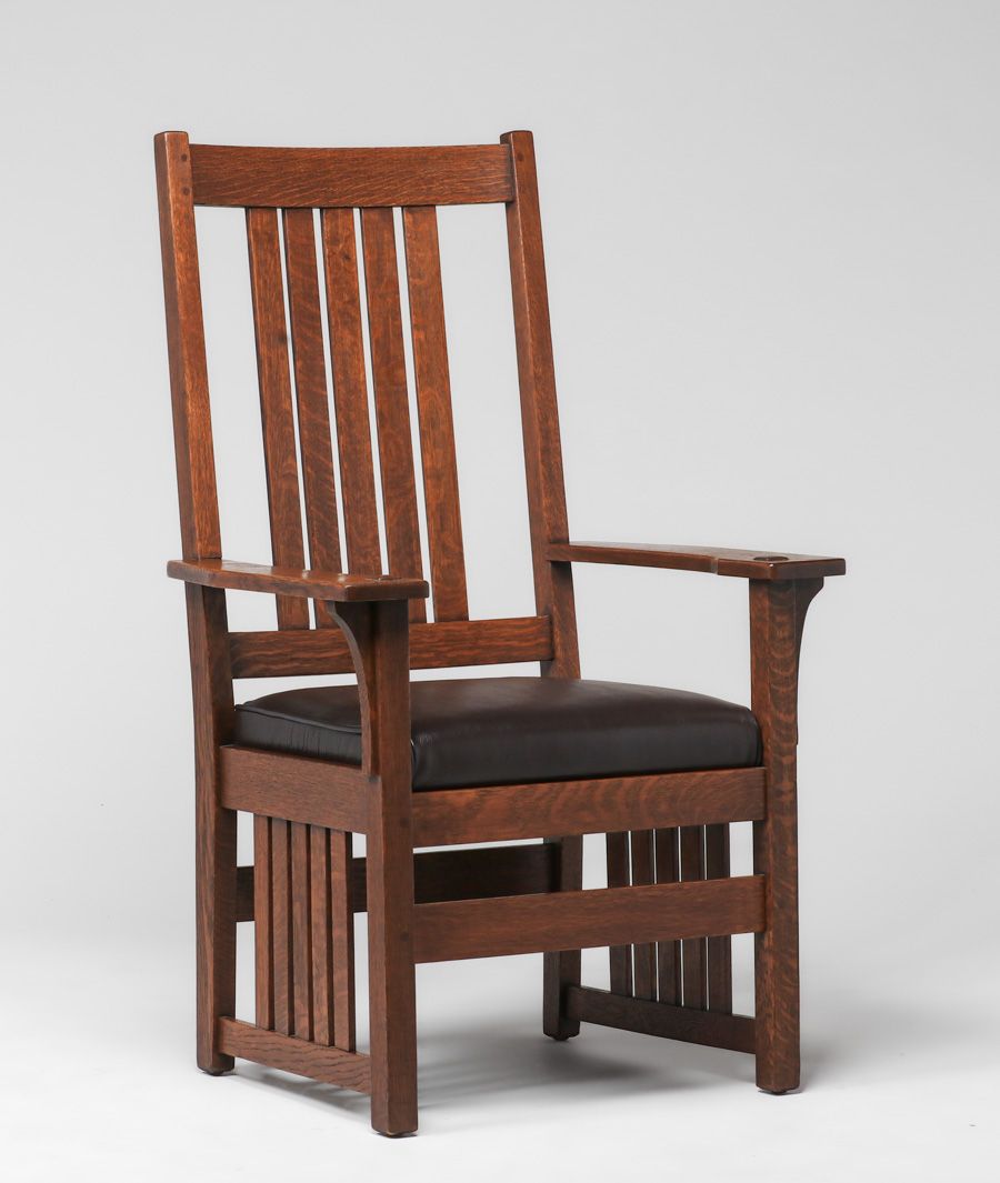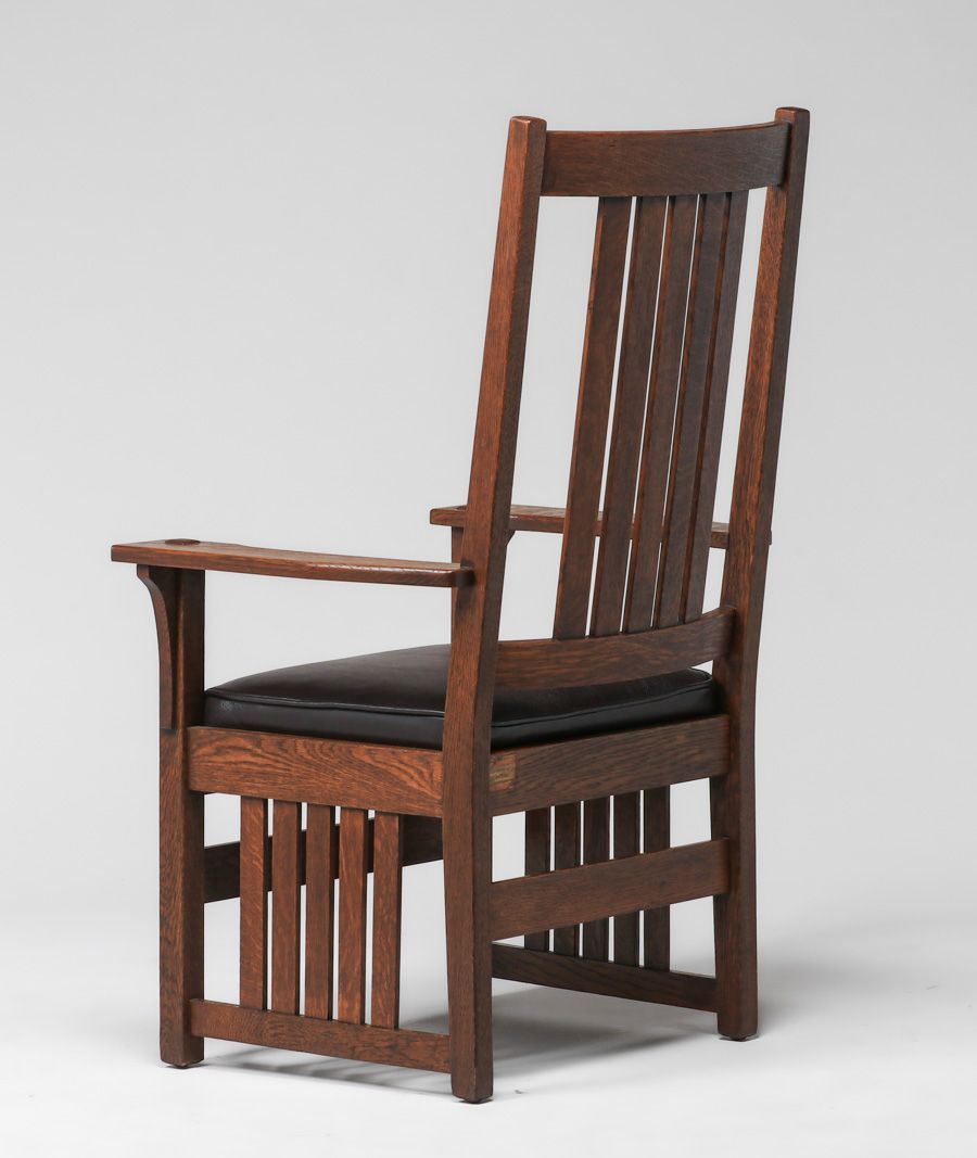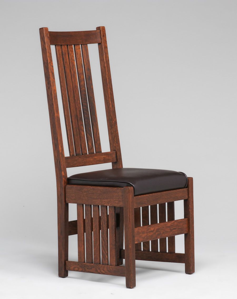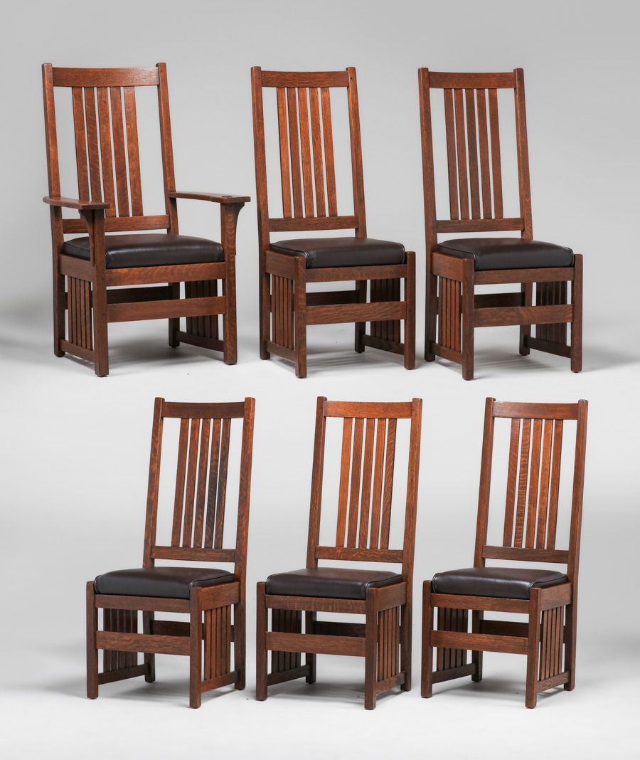 L&JG Stickley Set of 6 Slatted Tallback Chairs c1905-1907. Signed. Very nicely refinished. Rock solid sturdy. Arm chair 45.5"h x 27.5"w x 21"d. Side chairs 45″h x 19.25″w x 17.25″d SOLD