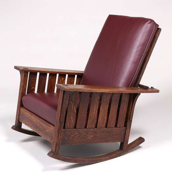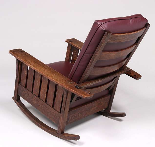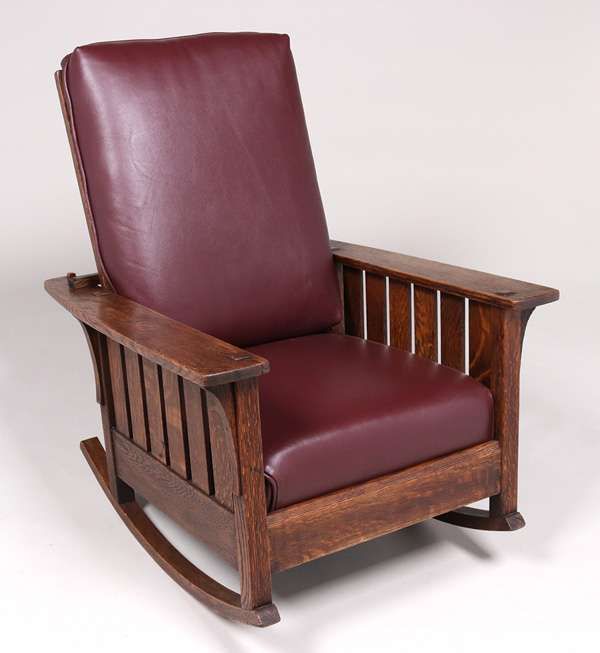 L&JG Stickley slatted Morris Rocker c1907. Signed. Excellent original finish. 40"h x 31.75"w x 35"d SOLD