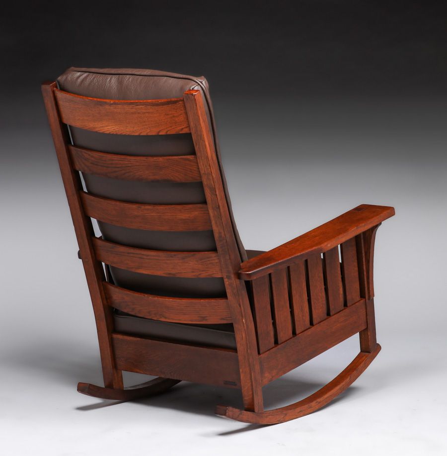 L&JG Stickley Tallback Slatted Rocker c1912-1915. Signed with branded mark. Excellent original finish. 43"h x 32"w x 33.25"d $2800