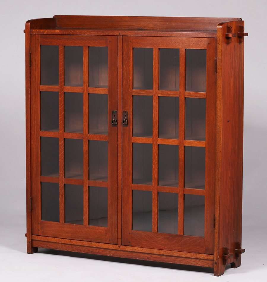 L&JG Stickley two-door bookcase with tenon & key construction. Unsigned. Excellent original finish. 55.25"h x 49"w (52"w with tenons) x 12"d SOLD