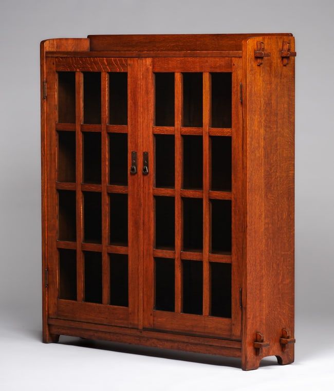 L&JG Stickley Two-Door Bookcase c1910. Unsigned. Back Panels replaced. Excellent original finish. 55.5"h x 49"w (52.5"w with tenons) x 12"d.