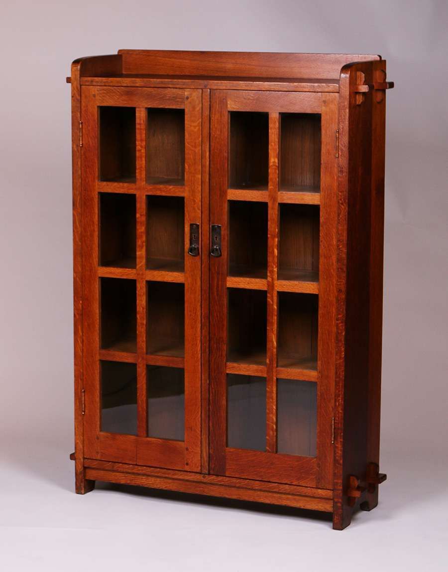 Matched Pair of L&JG Stickley Two-Door Bookcases with Tenon & Key Construction. Excellent original finish. Unsigned. 55"h x 36"w (+3" with Tenons) x 12"d SOLD