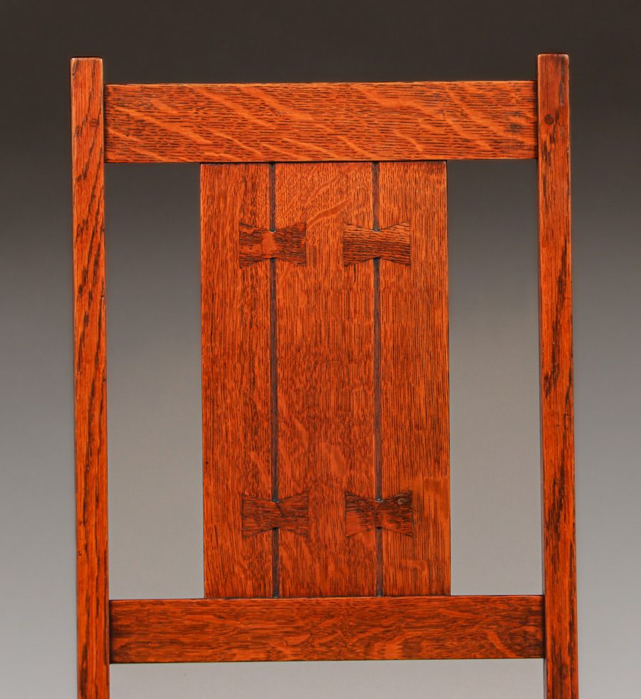 Rare L&JG Stickley Butterfly Joint Side Chair c1910. This side chair matches the L&JG Stickley #711 Butterfly Joint Sideboard. Unsigned. Excellent original finish. 38"h x 17 5/8"w x 18.75"depth at feet
