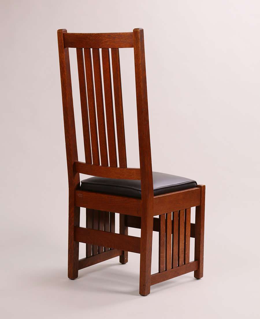 Rare L&JG Stickley tallback side chair with side slats under seat. Signed. Excellent original finish. 45"h x 19"w x 17"d SOLD