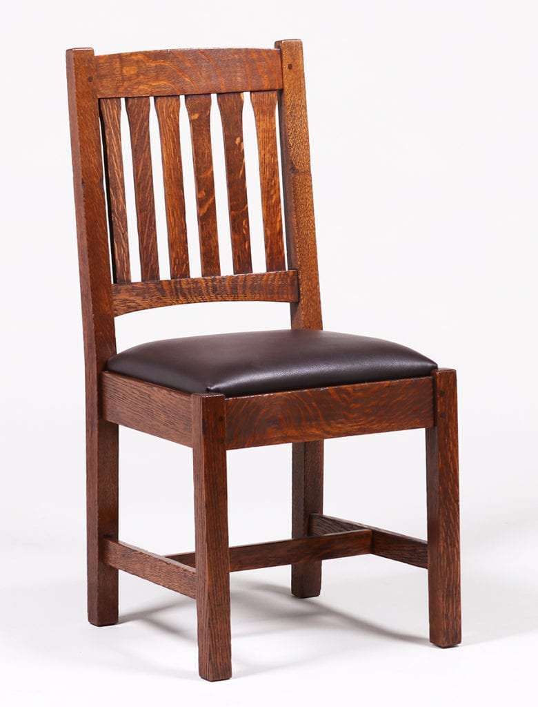Set of 6 L&JG Stickley #323 “Arrowback” dining chairs. Signed. Excellent original finish. Very sturdy. This is considered by many of us to be the best model of dining chair by L&JG Stickley. Side chairs #323 measure 38″h x 18.5″w x 18″d. Armchair #324 measures 29″h x 26″w x 23″d SOLD