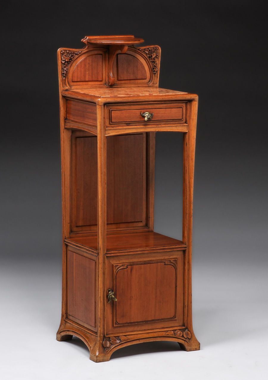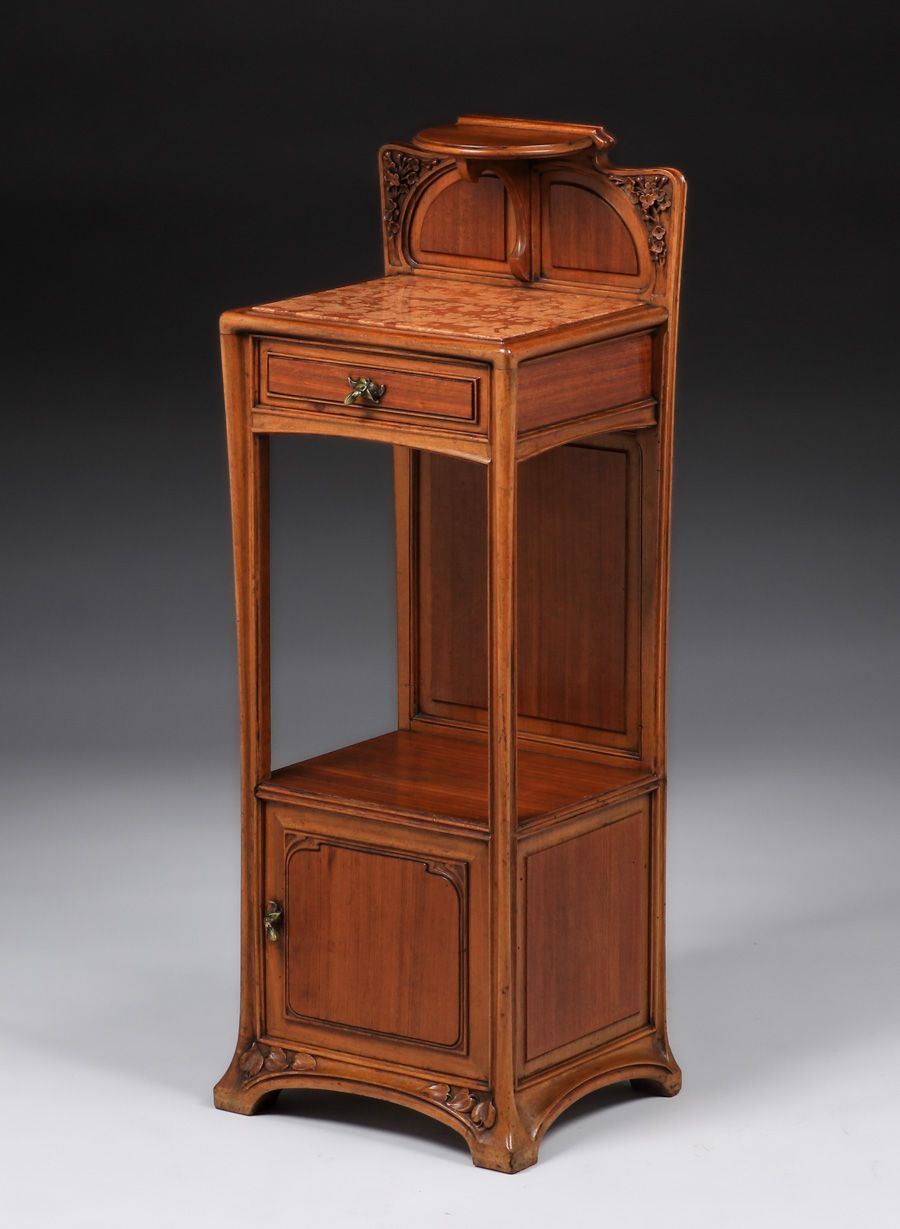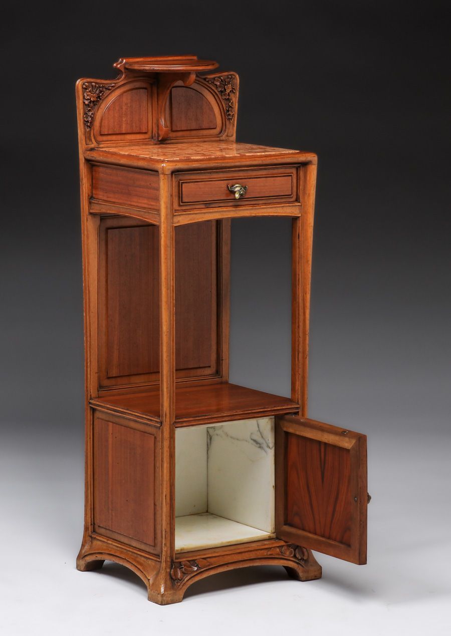 Louis Majorelle French Art Nouveau Marbletop Beside Table c1900. Signed. Excellent original finish. 41"h x 15"w x 12.25"d SOLD