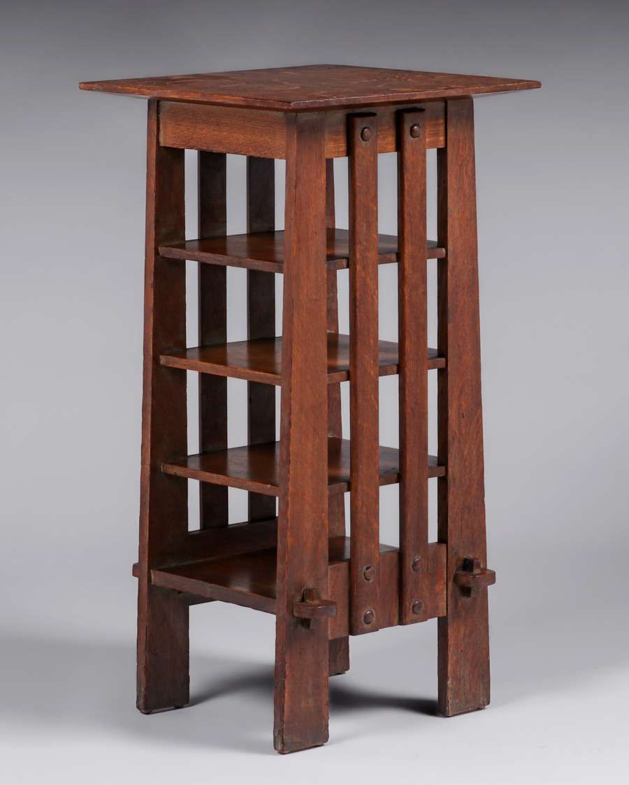 Michigan Chair Co Oak Slatted Magazine Stand c1905. Signed. Excellent original grey wash finish. Very sturdy. 32.25″h x 16.5″ x 16.5″ $2200