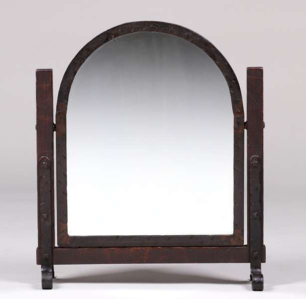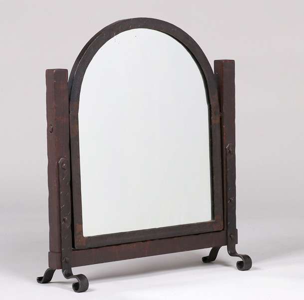Monterey Furniture Table-Top Mirror with hand-forged iron strap-work c1920s. Unsigned. Excellent original finish. 22.5"h x 19"w x 6"d SOLD