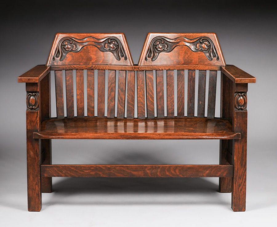 - David Kendall – Phoenix Furniture Co #772 Carved Oak Bench c1895