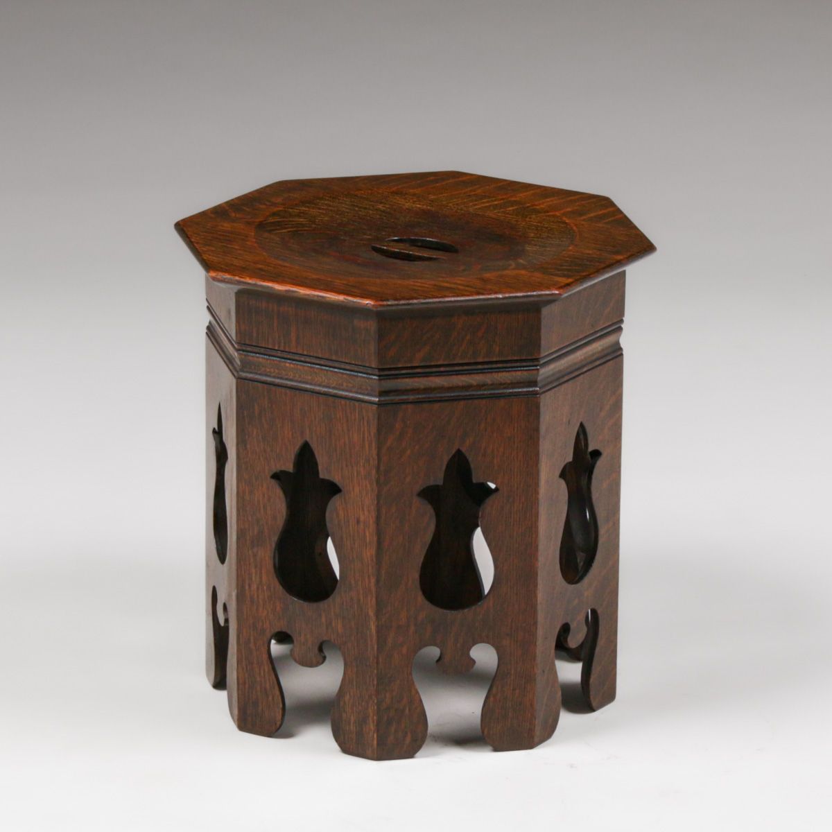 David Kendall – Phoenix Furniture Co Cutout Taboret c1895. Kendall was one of the important, early Grand Rapids, MI designers that influenced countless other furniture designers during the earliest part of the American Arts & Crafts Movement. A similar form is in the Collection of The Metropolitan Museum of Art, New York . Unsigned. Excellent original finish. 17″h x 16″d
