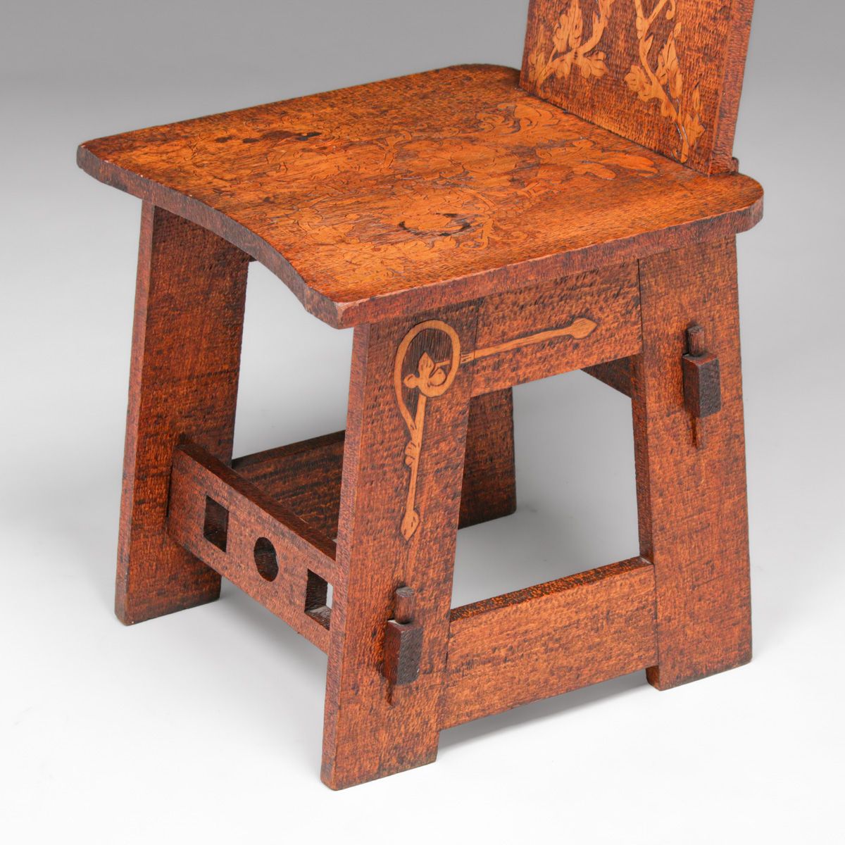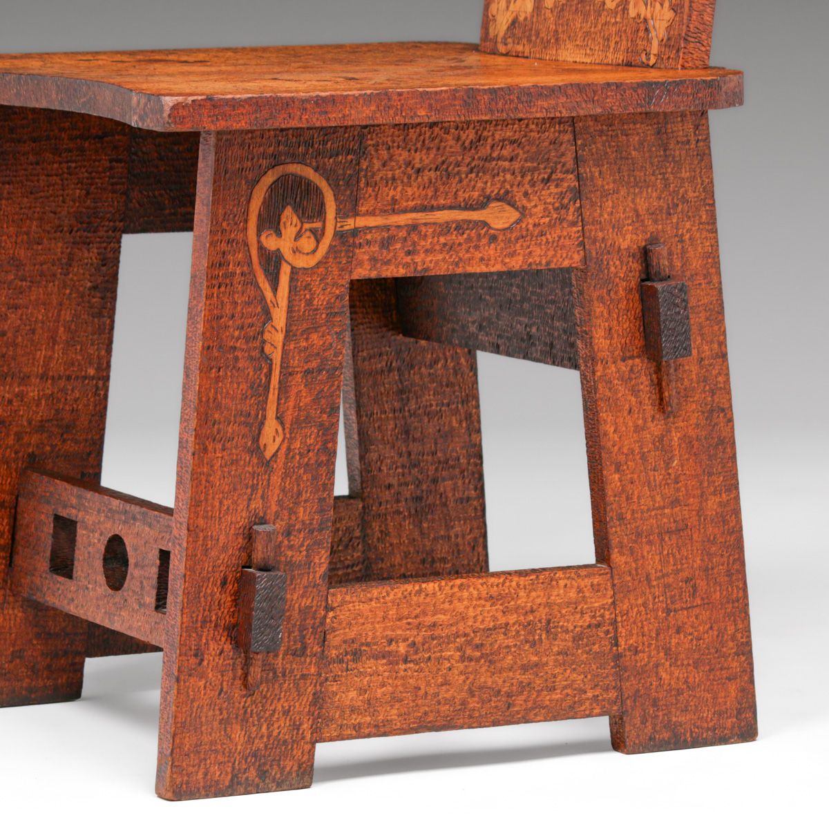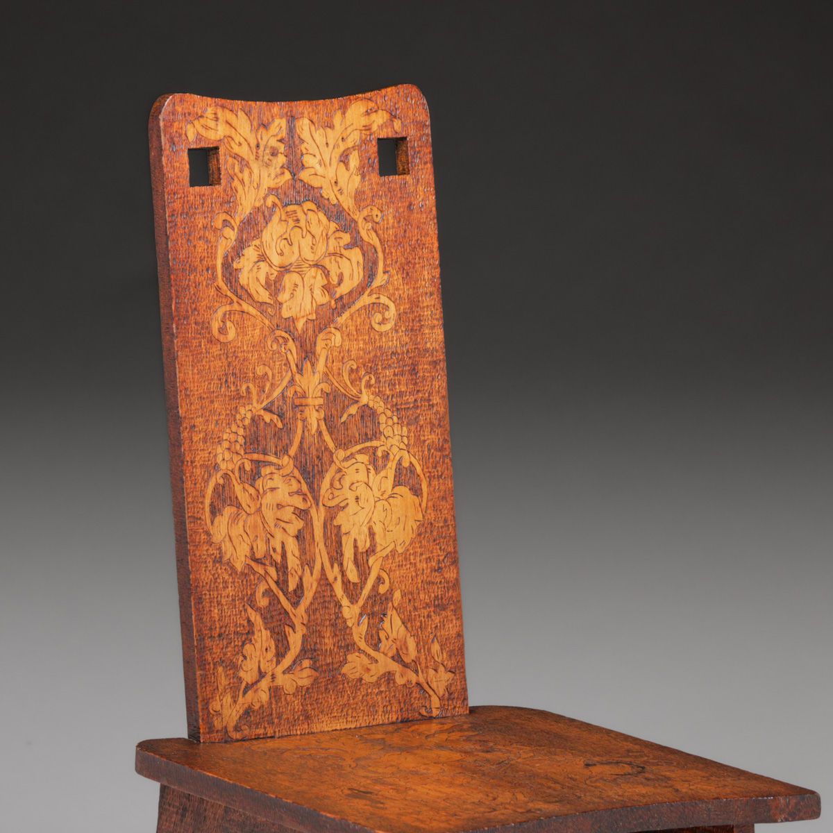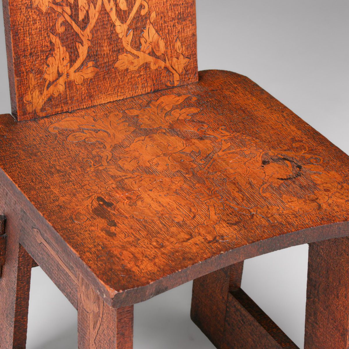 - Arts & Crafts Period Hand-Carved Pyrography Cutout Hall Chair c1905